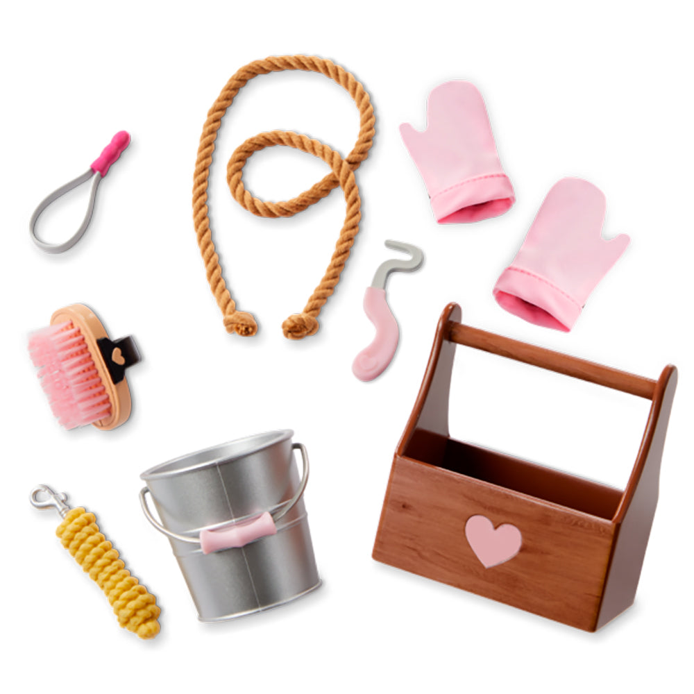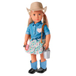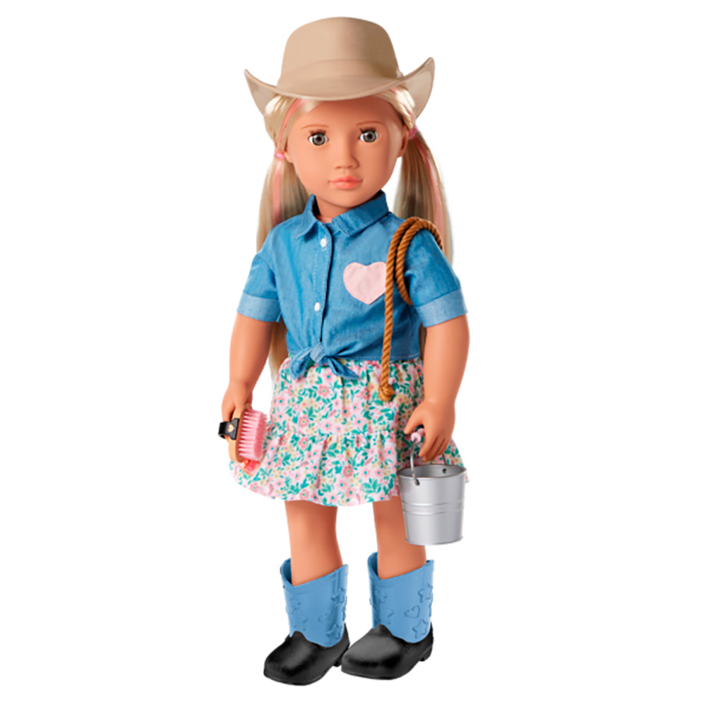 - 1 poupée non articulée de 46 cm (18 pouces), 1 chapeau de cow-boy, 1 chemise, 1 jupe, 1 paire de sous-vêtements, 1 paire de bottes de cowboy, 1 paire de gants d'équitation, 1 seau, 1 pinceau, 1 grattoir broyeur, 1 anneau de dentition en corde, 1 cure-pied, 1 corde et 1 panier de rangement