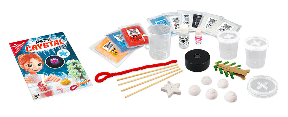 Cultive 12 étonnants et magnifiques cristaux : découvre l’arbre à cristaux instantanés, réalise un bijou cristallisé ou fais pousser un méga cristal. Place tes cristaux sur la base lumineuse et regarde la lumière transpercer le cristal !