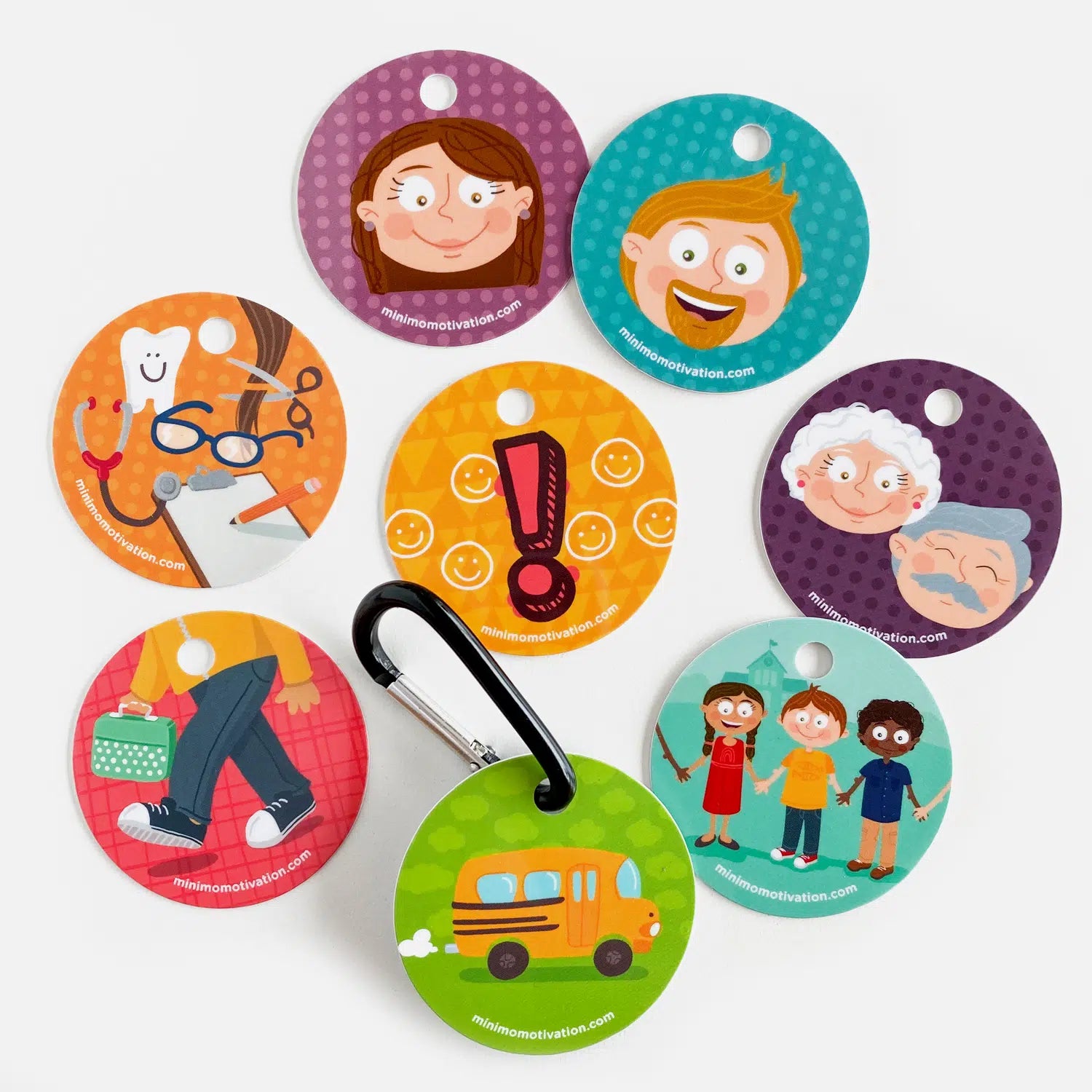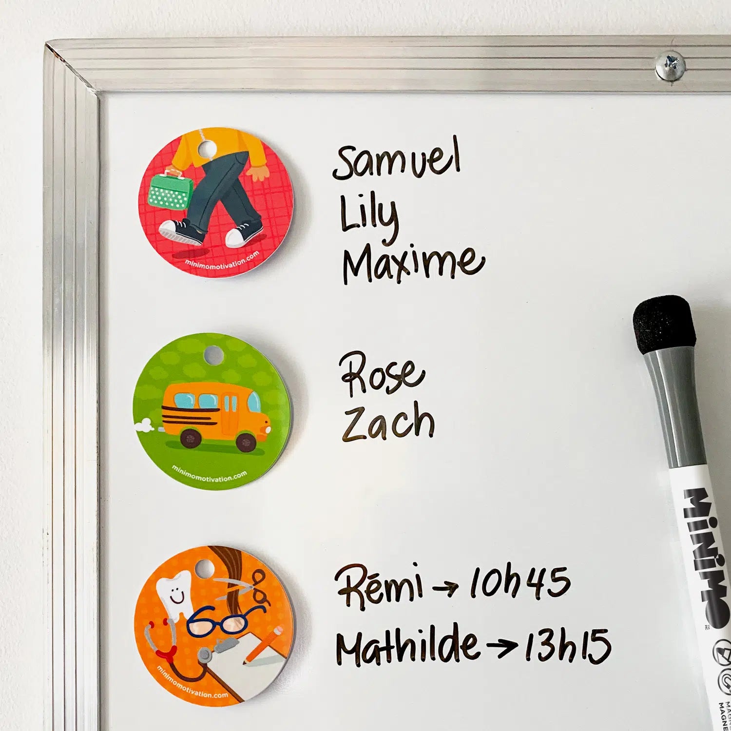 Avec l’ensemble pratique Aide-mémoire Retour à la maison, rappelle à ton mini de façon pratico-ludique comment se déroule son départ de l’école. Qu’il quitte en autobus ou à pied, avec papa ou mamie, à la fin de la journée ou pour un rendez-vous, c’est l’outil parfait pour rassurer les petits écoliers… et le personnel scolaire!
