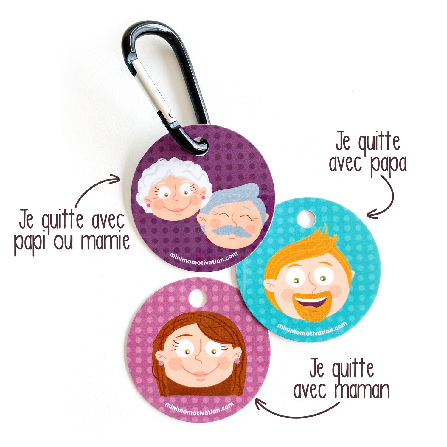 - Accroche la pastille au sac à dos de ton enfant avec le mousqueton inclus