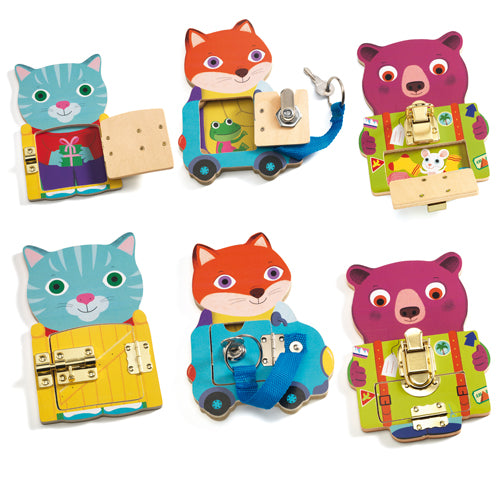 Découvrez le jeu de manipulation Locktou de Djeco, un coffret avec 3 animaux en bois avec des serrures pour les enfants à partir de 3 ans. Votre enfant va exercer sa motricité en ouvrant et fermant les différentes serrures sur les trois animaux rigolos.