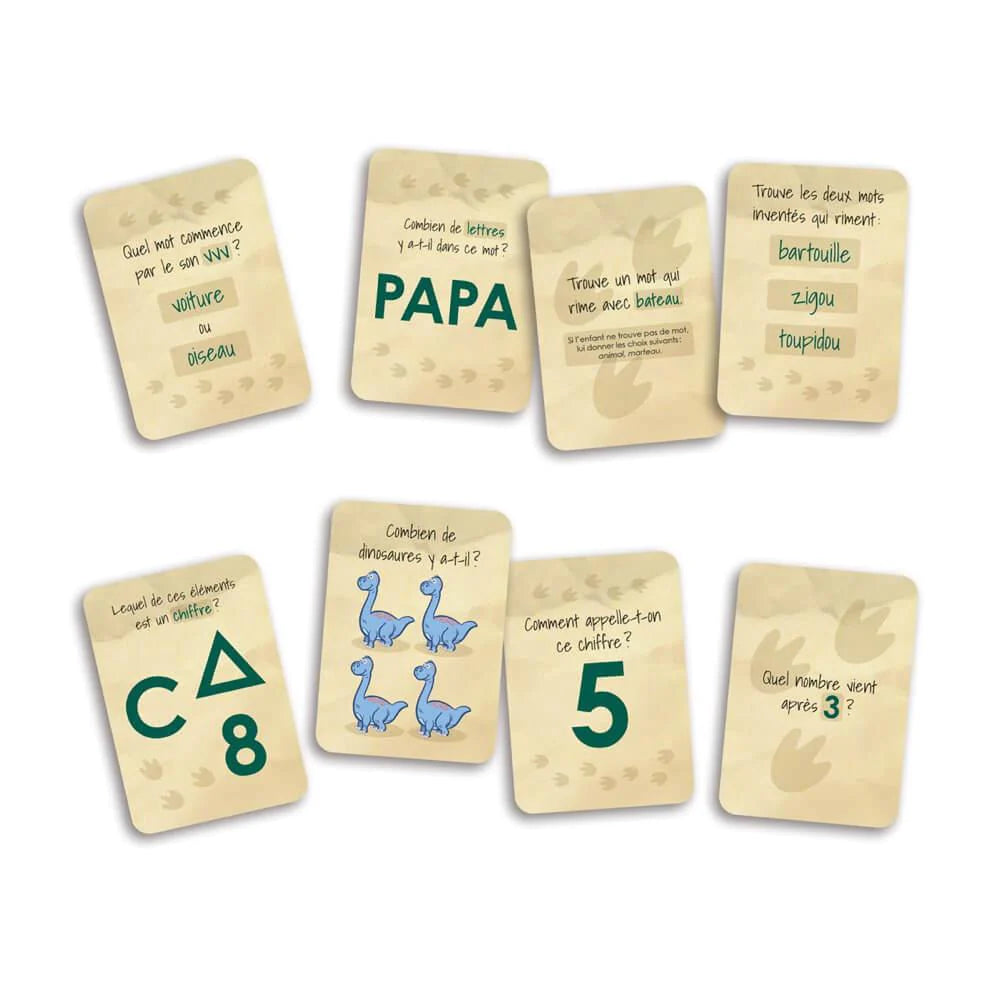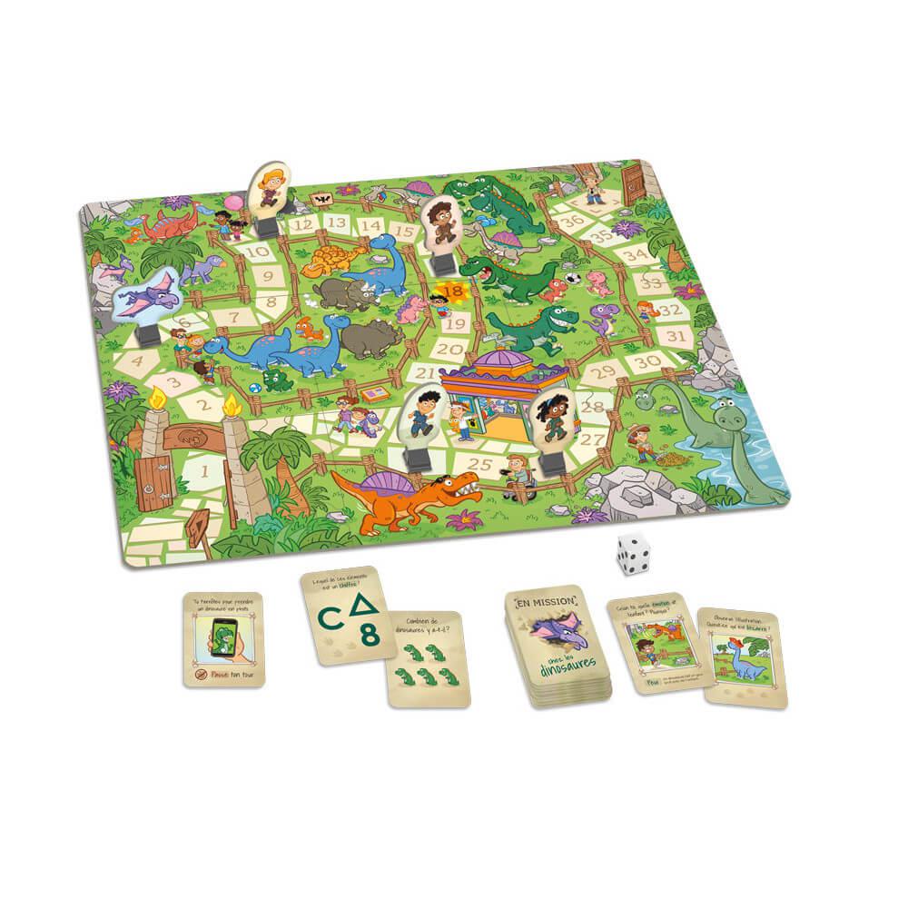 En mission chez les dinosaures a été conçu pour soutenir le développement global de l’enfant de 4 ans à 5½ ans. Dans ce jeu de parcours, l’enfant cherche notamment à reconnaitre des émotions et leurs causes, à décrire à l’oral des situations bizarres vécues par des dinosaures, à reconnaitre les nombres de 0 à 10 et quelques lettres de l’alphabet, ainsi qu’à prendre conscience des sons qui composent les mots.