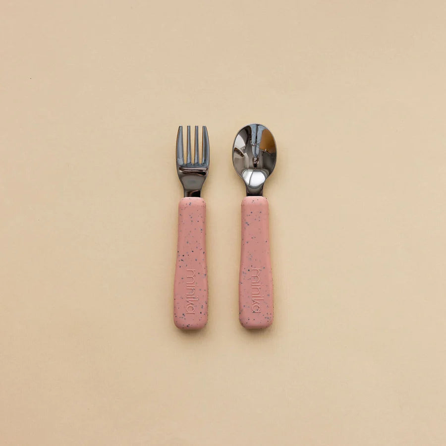 Ensemble de fourchette et cuillère avec poignée en silicone. Silicone alimentaire sans BPA, PVC, phtalates et sans plomb. Laver avec du savon et un chiffon mouillé ou au lave-vaisselle. Acier inoxydable. Poignée en silicone anti-dérapante.