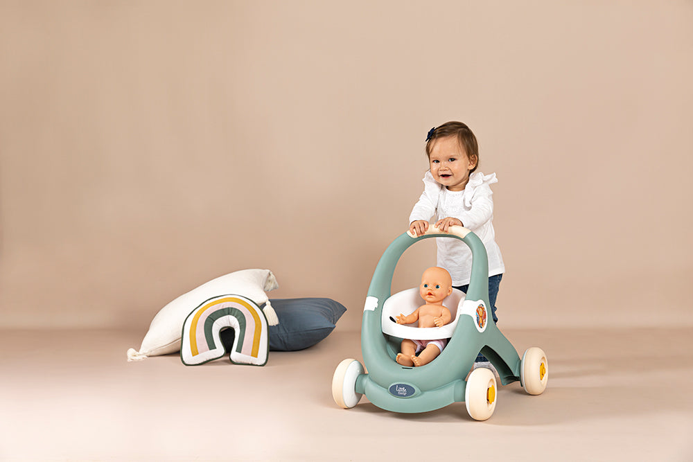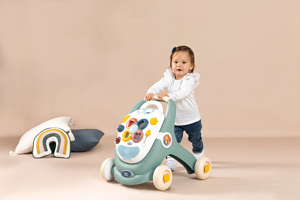 Avec le trotteur sécurisé Little Smoby 3 en 1, les jeunes enfants peuvent découvrir le monde en toute sécurité, et ce aussi bien au niveau de la motricité que des sens : car ce véhicule est à la fois un trotteur, une planche d'activités et une poussette de poupée !