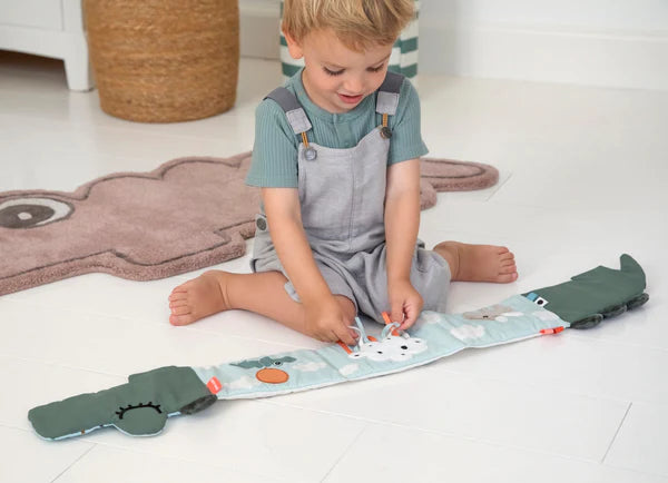 Le livre doux et dépliant est rempli de couleurs et d’éléments heureux. Le crocodile vert réserve des surprises passionnantes comme des points ludiques de différentes couleurs et des rayures contasting en noir et blanc.