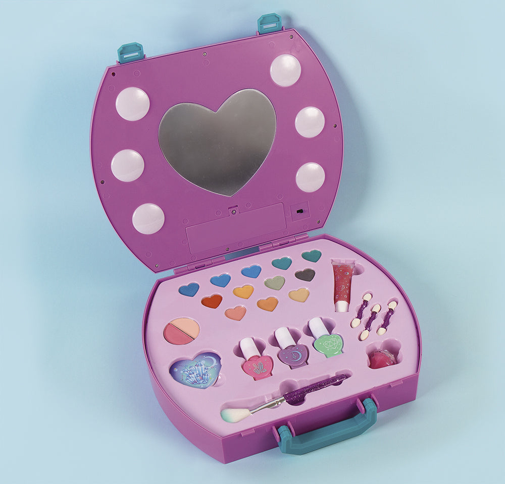 Magnifique étui en plastique moulé en forme de coeur rempli de tout votre maquillage et vos cosmétiques essentiels. Allumez les lumières et sentez-vous comme une star de cinéma.