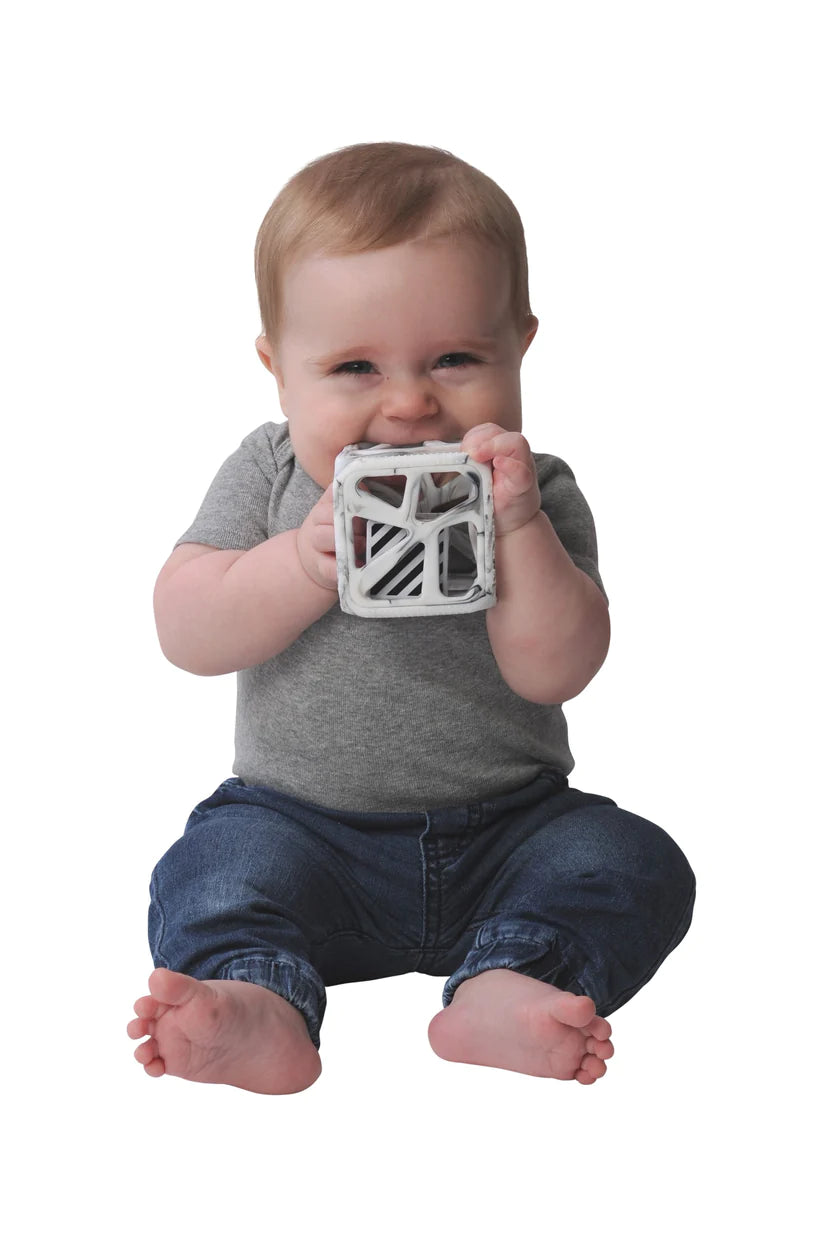 Le Malarkey Kids Chew Cube est le hochet et le teether moderne créé par maman. Il fournit une stimulation sensorielle à quatre voies, y compris des bords de dentition doux et texturés pour les gencives tendres; de grands trous flexibles pour aider bébé avec des compétences de préhension ainsi qu’un hochet à motifs noirs et blancs avec des miroirs pour stimuler les oreilles et les yeux du bébé.