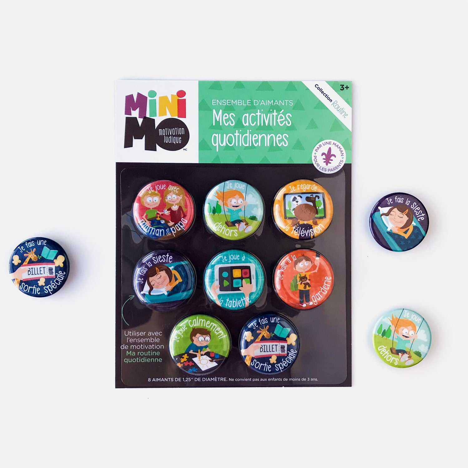 - 8 aimants ronds, illustrés avec les différentes activités de la routine quotidienne