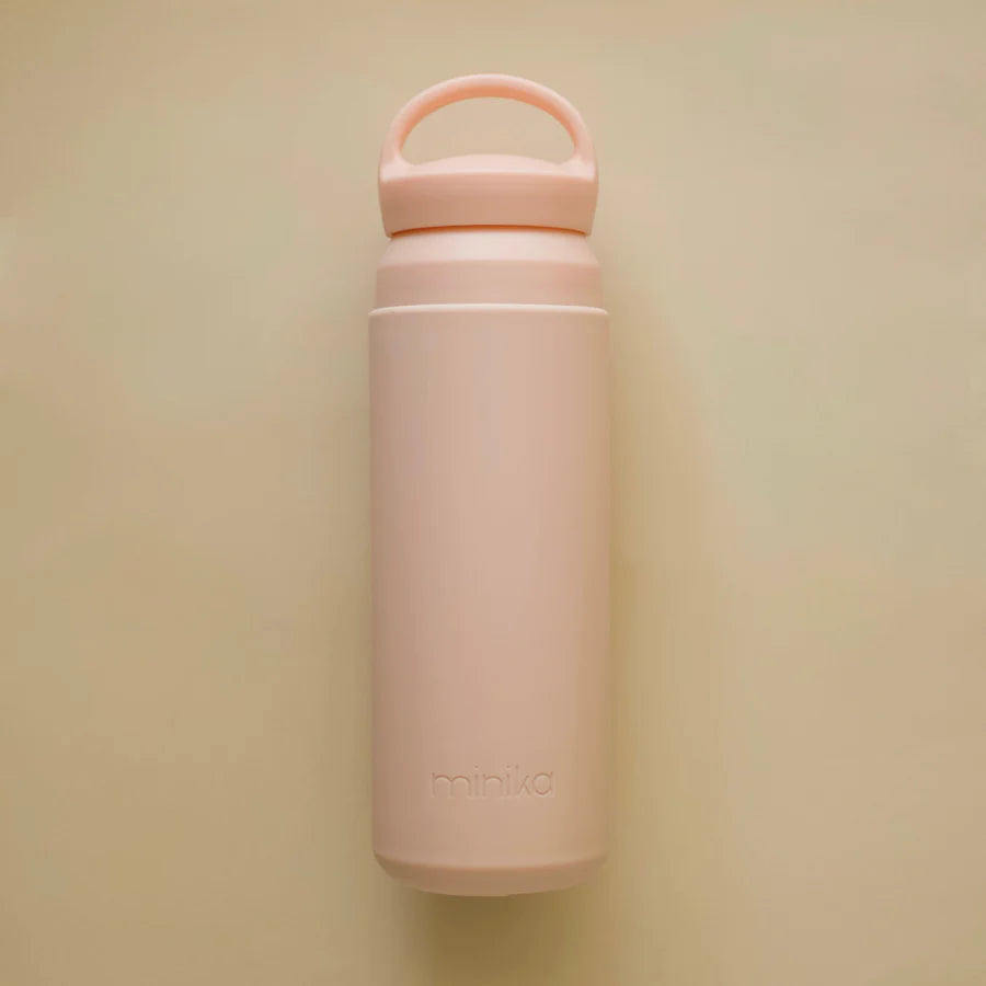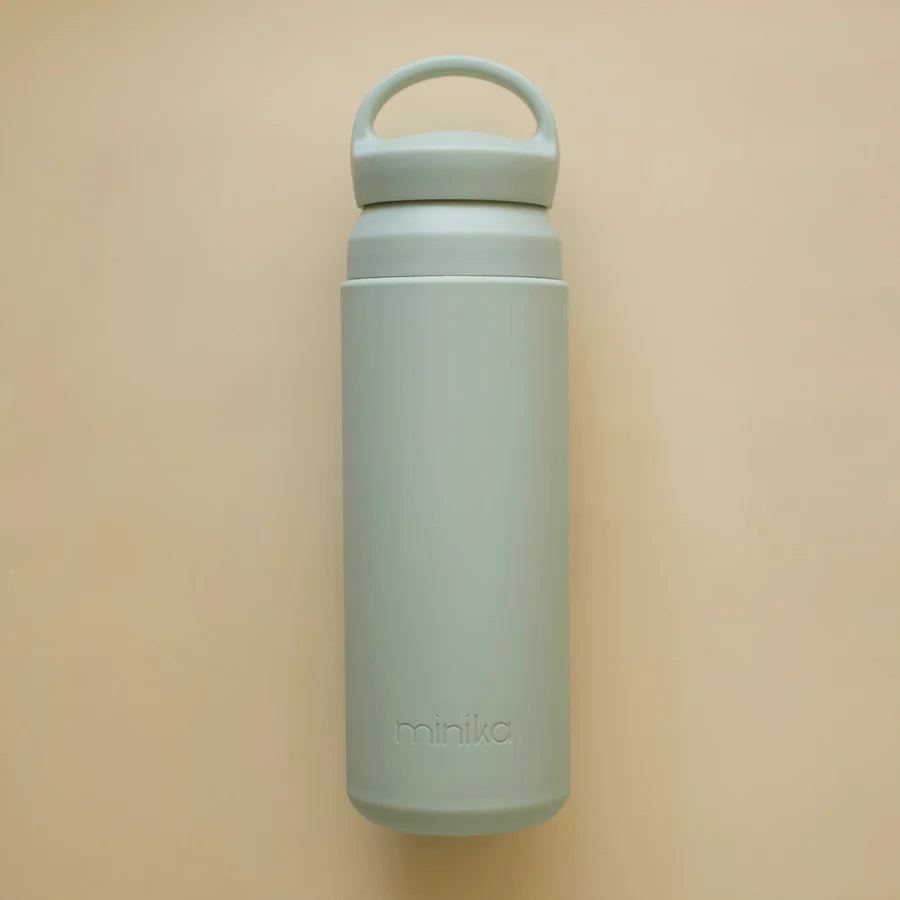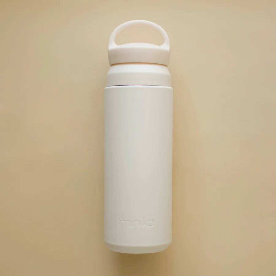 La bouteille isotherme Minika de 480ml est parfaite pour les petits et les adultes. Son capuchon double permet d'insérer de la glace ou des fruits sans qu'ils ne sortent pendant que vous buvez. En acier inoxydable 18/8, elle est sans BPA, plomb et phtalates. Son manche en silicone et sa poignée sur le couvercle la rendent facile à transporter.