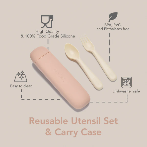 L'étui de transport en silicone est conçu pour s'adapter à la plupart des fourchettes et cuillères, garantissant ainsi leur propreté et leur protection entre les repas. Cet étui est non seulement une solution de rangement pratique, mais permet également de garder les essentiels du repas organisés et hygiéniques. À la maison ou en déplacement, c'est le compagnon idéal pour les ustensiles de votre enfant.