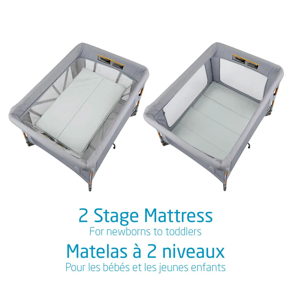 Le Swift est doté d'un matelas unique à 2 niveaux qui se dézippe pour s'adapter parfaitement à la bassinette, offrant un matelas plus petit et plus confortable, idéal pour les nouveau-nés. À mesure que votre bébé grandit, le matelas se referme ensemble pour créer un espace plus grand et super confortable pour le temps de jeu ou une sieste bien méritée.