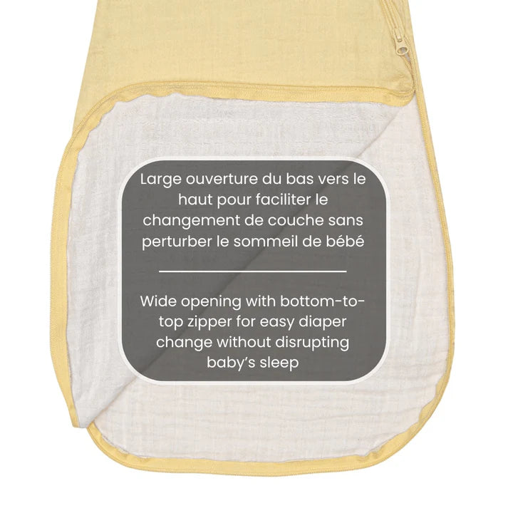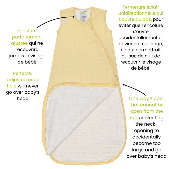 Cette dormeuse 0.7 TOG en mousseline 100% coton est fabriquée à partir d’un tissu respirant, doux et léger pour la peau de bébé. Elle deviendra votre meilleure alliée lors des températures plus chaudes ou températures modérées avec des vêtements de nuit appropriés.