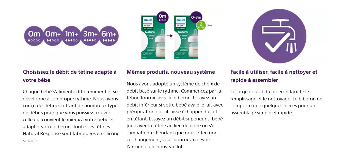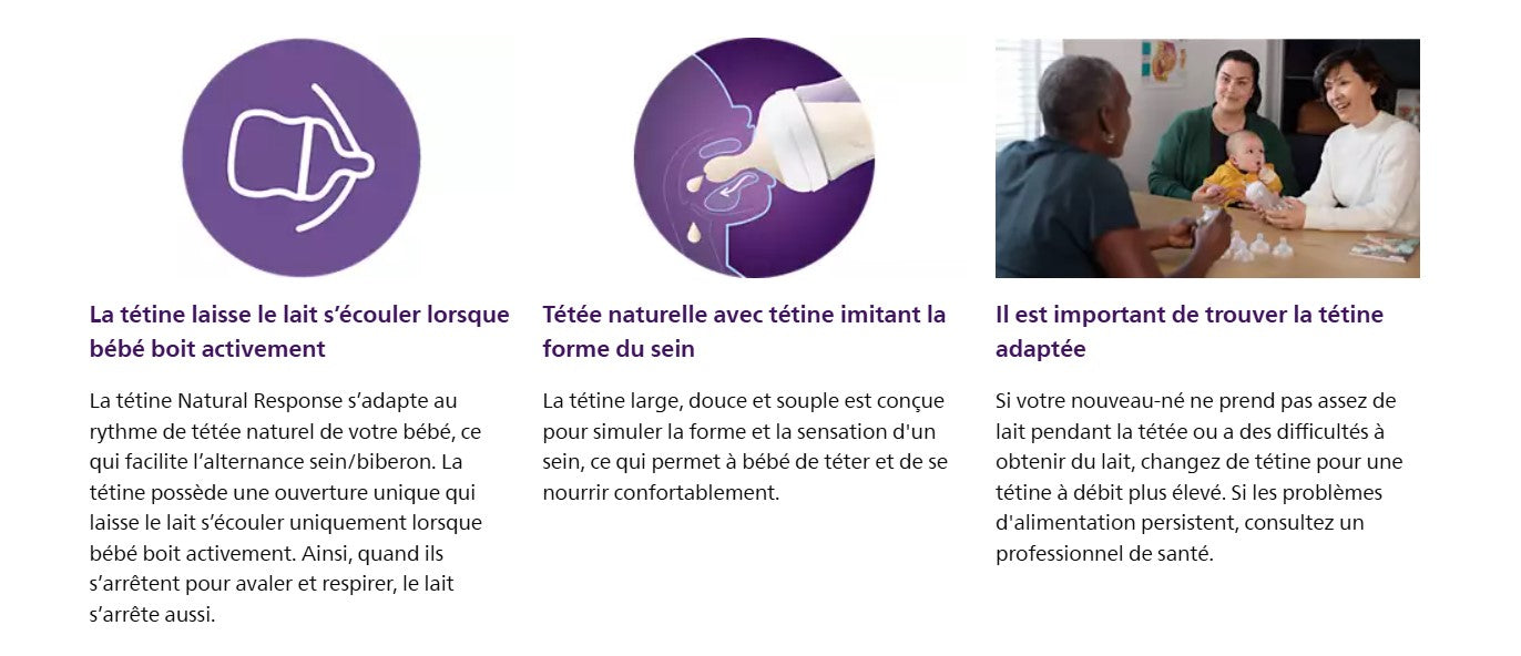 La tétine Natural Response libère le lait uniquement lorsque le bébé tète activement. Les bébés peuvent téter à leur propre rythme, comme au sein, ce qui facilite l'alternance entre allaitement au sein et au biberon. Il est important de trouver la bonne tétine. Voir plus d'informations ci-dessous.
