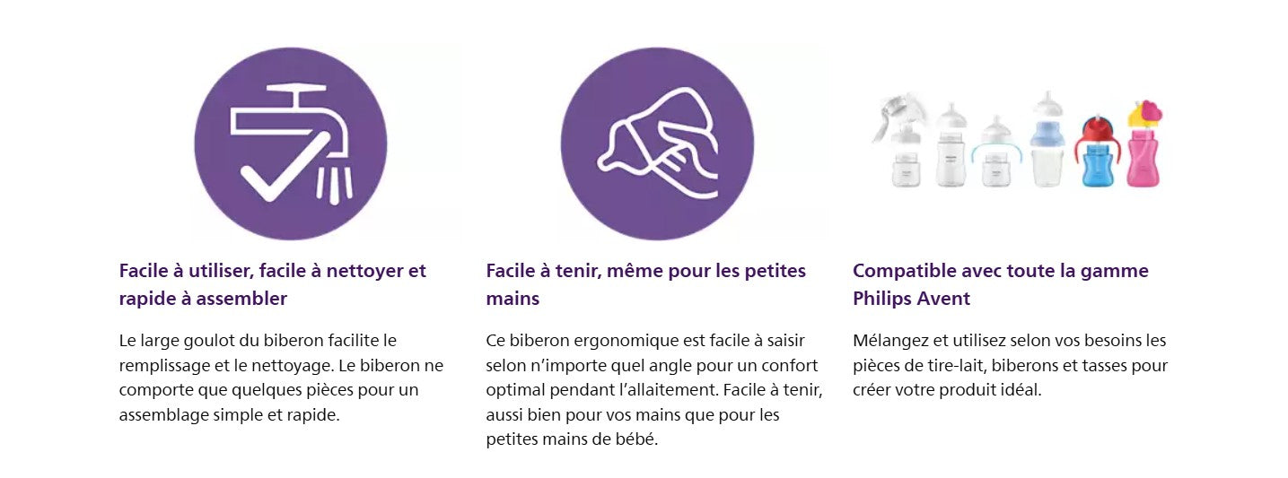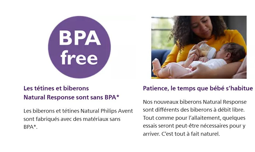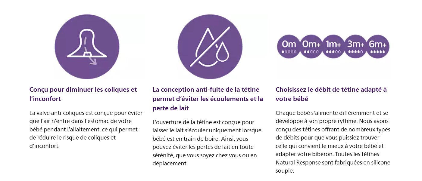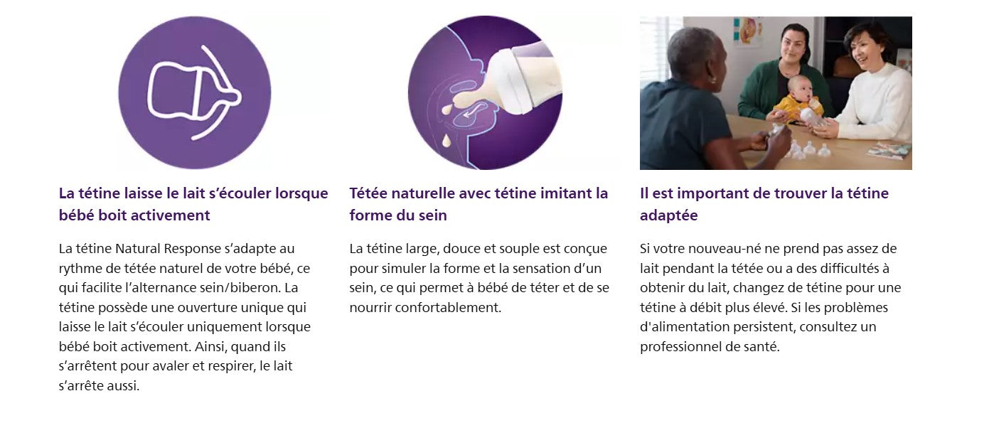 La tétine Natural Response libère le lait uniquement lorsque le bébé tète activement. Les bébés peuvent téter à leur propre rythme, comme au sein, ce qui facilite l'alternance entre allaitement au sein et au biberon. Il est important de trouver la bonne tétine. Voir plus d'informations ci-dessous.