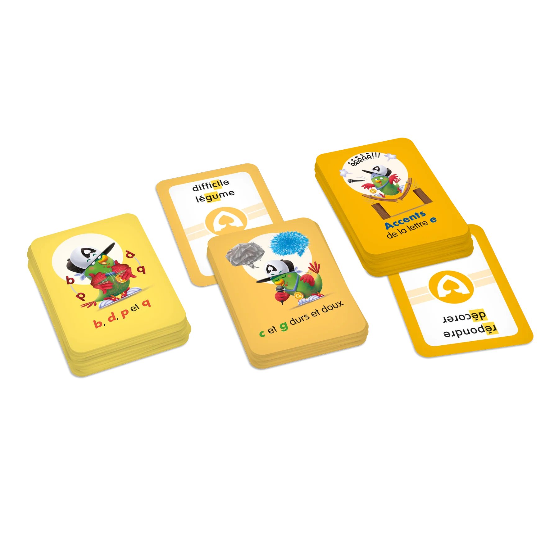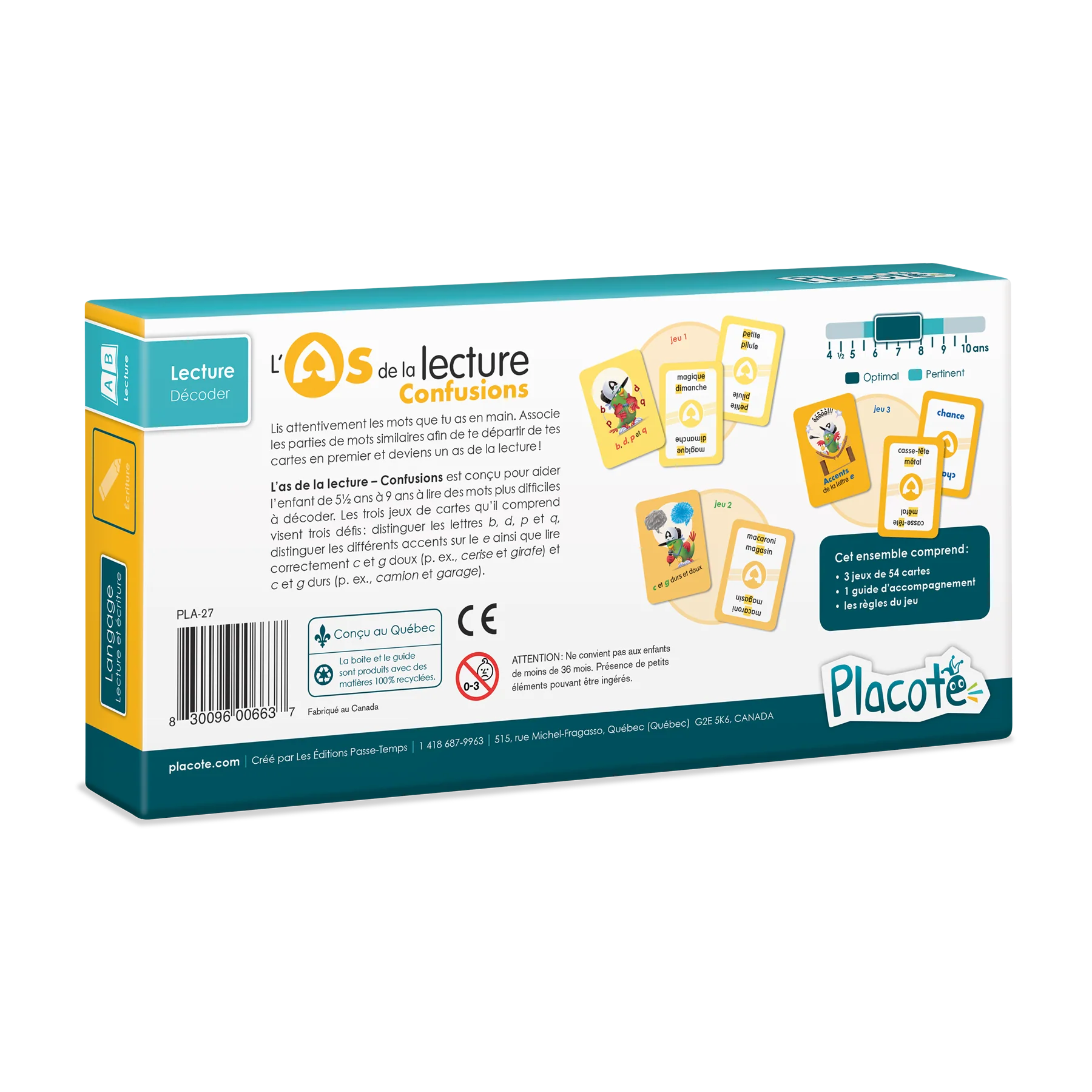 L’as de la lecture – Confusions est conçu pour aider l’enfant de 5½ ans à 9 ans à lire des mots plus difficiles à décoder. Les trois jeux de cartes qu’il comprend visent trois défis: distinguer les lettres b, d, p et q, distinguer les différents accents sur le e ainsi que lire correctement c et g doux (p. ex., cerise et girafe) et c et g durs (p. ex., camion et garage).
