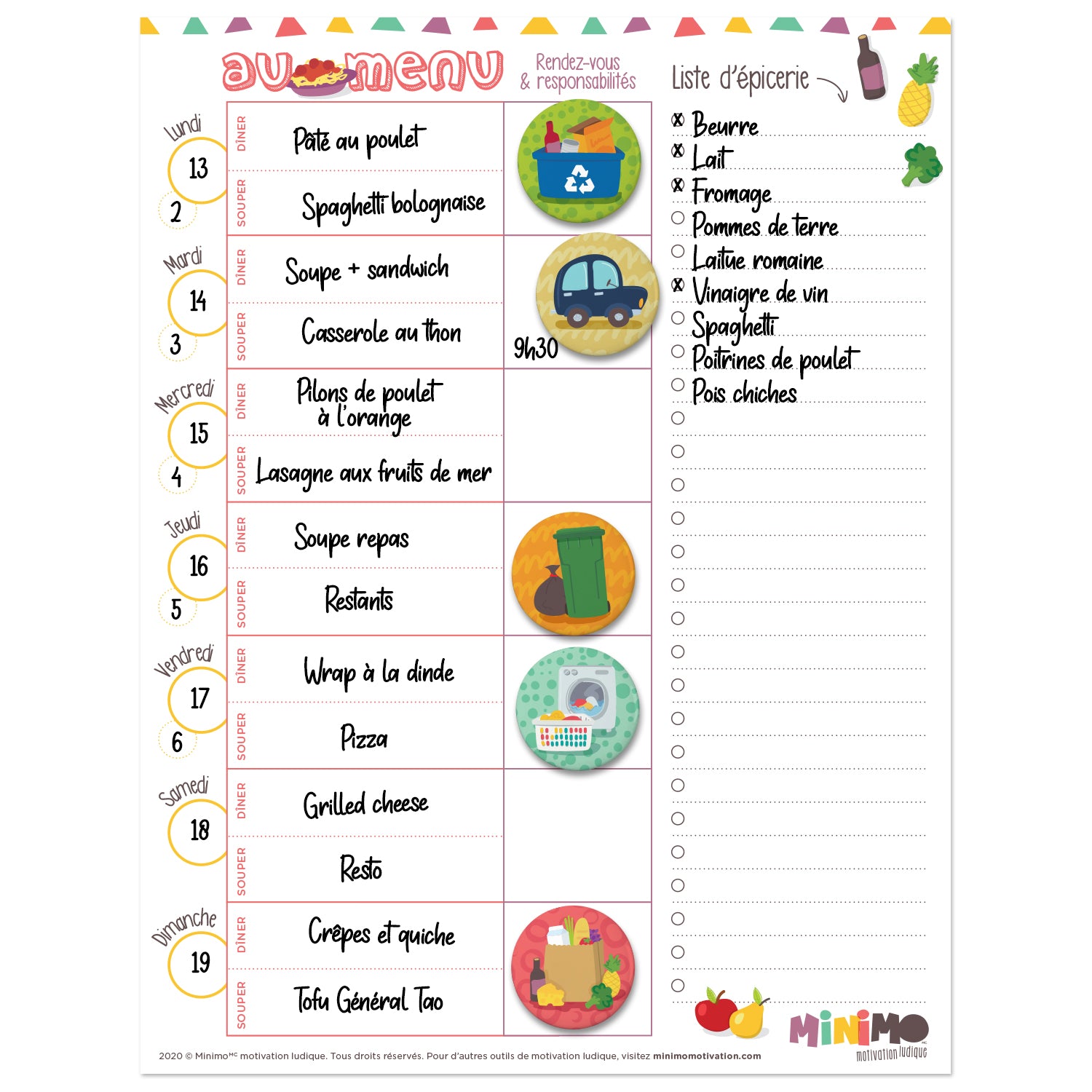Le planificateur de repas Qu’est-ce qu’on mange? est un outil pratico-ludique qui te permet de planifier les repas de la semaine et de les afficher bien à la vue de tous les membres de ta famille. Fini les «Mamaaaan, qu’est-ce qu’on mange pour souper?» et les oublis à l’épicerie! Réduis le gaspillage alimentaire… en même temps que ta charge mentale et gagne du temps précieux avec ta famille.
