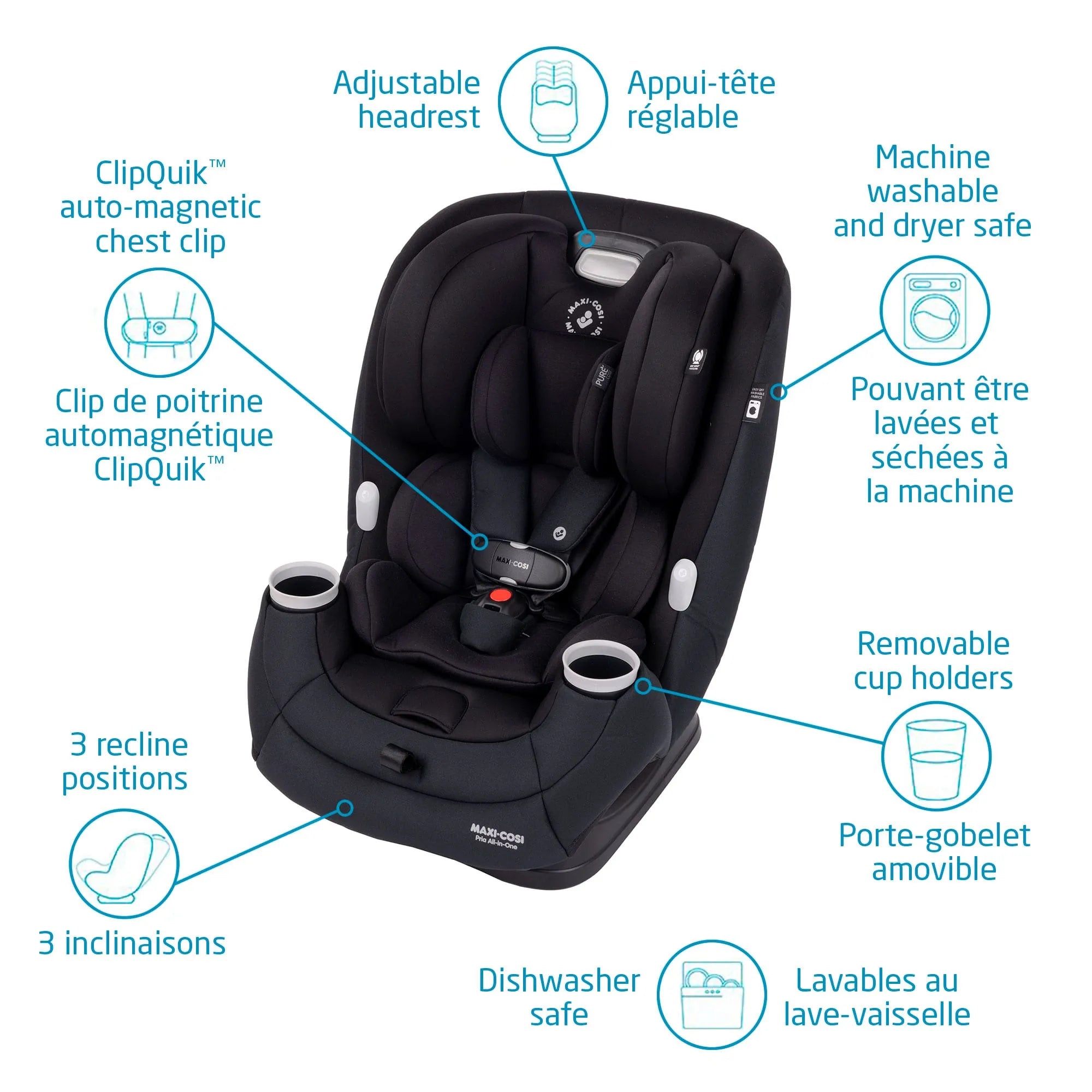 - 2 Porte-gobelets – Le Siège d’auto Pria Tout-En-Un offre le double de rangement, lorsque les collations doivent accompagner la boisson préférée de votre enfant! Sans BPA et lavable au lave-vaisselle pour un nettoyage facile en cas de besoin!