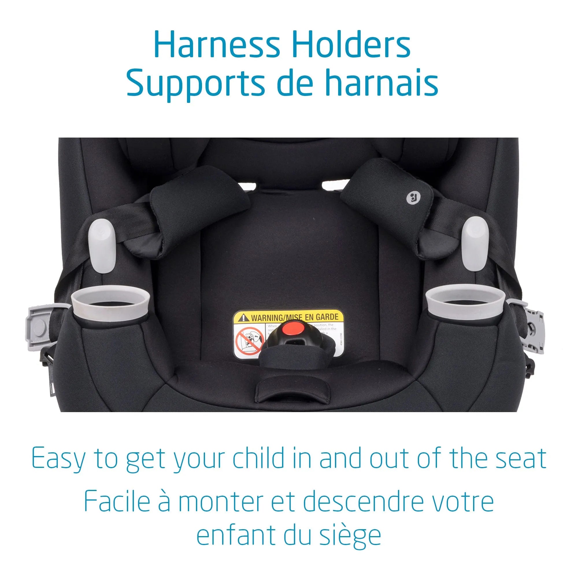 - Supports de harnais – Ne vous pencher plus jamais derrière votre enfant pour retrouver le harnais! Les supports maintiennent le harnais dans une position de retrait qui vous permet d’installer facilement votre enfant dans le siège et de le boucler.