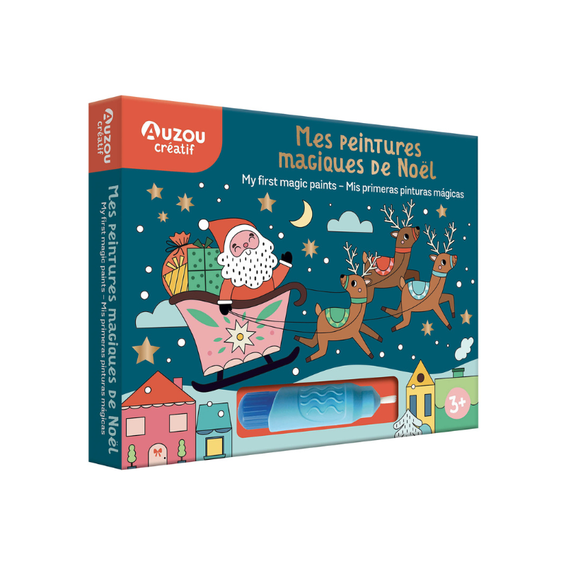 Ouvre le réserver de ton gros pinceau magique, remplis-le d’eau… et fais apparaître et réapparaître les couleurs de tes 8 tableaux magiques sur le thème de Noël !Une activité à faire et à refaire !Le gros pinceau à réservoir d’eau est visible immédiatement à travers une fenêtre.