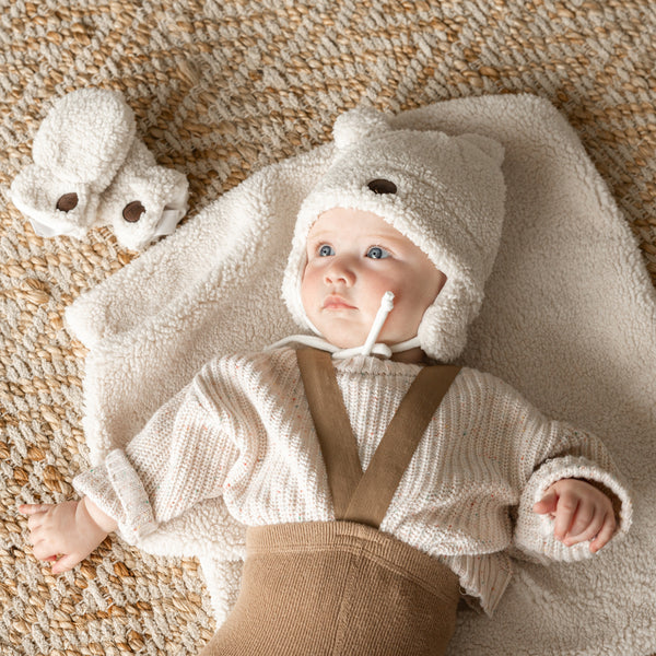 Ce magnifique ensemble accompagne bébé sur 3 saisons (printemps, automne et hiver), ce qui le rend un allié indispensable pour les mamans. Fabriqué en polyester tissé et Sherpa (effet mouton), il comprend une jolie paire de bottines, une tuque ourson ornée de mignonnes petites oreilles, une paire de mitaines et une douce couverture moelleuse pour garder bébé confortable et au chaud durant les sorties extérieures. C’est le parfait agencement à notre nouvelle housse pour siège d’auto Sherpa (offert en modèle 3 saisons et Hiver) !