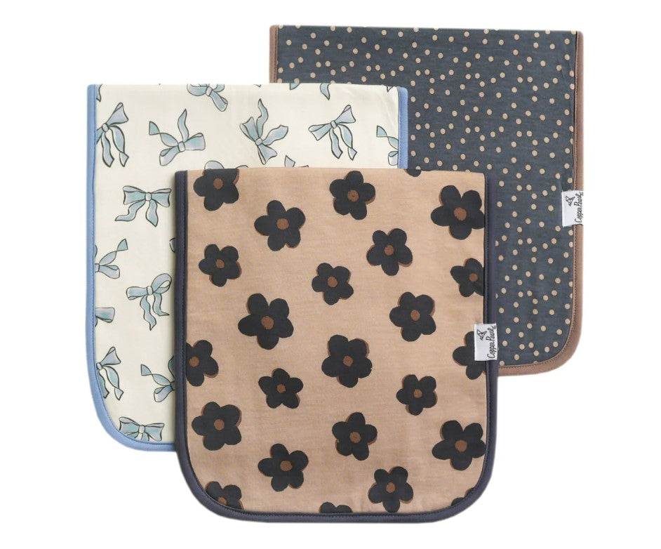 L'heure du rot de bébé est soudainement à l'ordre du jour grâce aux tissus tendance et appréciés qui vous ont fait tomber amoureux de Copper Pearl ! Qui aurait cru que bébé pouvait cracher avec style ? Conçu pour s'agencer parfaitement avec nos ensembles de bavoirs bandana, le devant de chaque bavoir avant-gardiste est doté de motifs modernes et chics sur 100 % coton. La norme Copper Pearl « la mode rencontre la fonctionnalité » frappe à nouveau l'or avec ces torchons ; les redoutables fuites de crachats et de bave sur les vêtements des parents appartiennent au passé ! Une couche intermédiaire en polaire offre une absorption supérieure, arrêtant les liquides désagréables de bébé dans leur élan. Une taille généreuse de 21 x 10 pouces offre une plus grande couverture des épaules (et moins de changements de tenue) pour maman et papa. Indispensable pour tout parent nouveau ou chevronné, nos torchons Copper Pearl sont le cadeau parfait pour toute occasion.