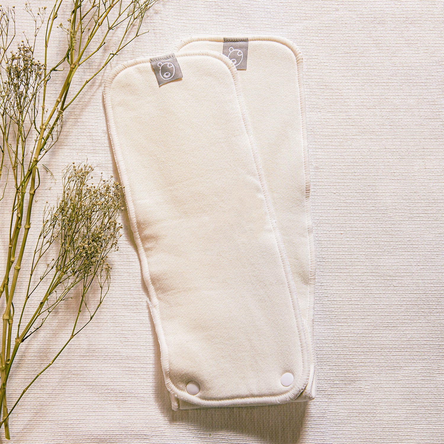 Cet insert évolutif est fait de deux inserts qui peuvent être utilisés ensembles, séparés ou repliés. Ces inserts peuvent être attachés ensemble à l'aide de boutons pression ou peuvent être utilisé séparément pour vous permettre un ajustement maximal. Cette versatilité vous permettra de l'utiliser de différentes façons pour suivre l'évolution de votre bébé. Chaque partie est fait de bambou de 4 épaisseurs. Le bambou est reconnu pour son grand pouvoir d’absorption.