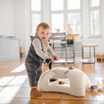 Les bébés peuvent se mettre debout, grimper, et pousser My First autour de la maison! My First est fait à partir d'un matériel amortissant (le même que vous trouveriez dans un siège d'auto), qui est sécuritaire pour les enfants ainsi que les meubles. Les pattes en dessous lui permettent de glisser légèrement, tout en donnant la stabilité aux bébés quand ils essaient de se mettre debout.