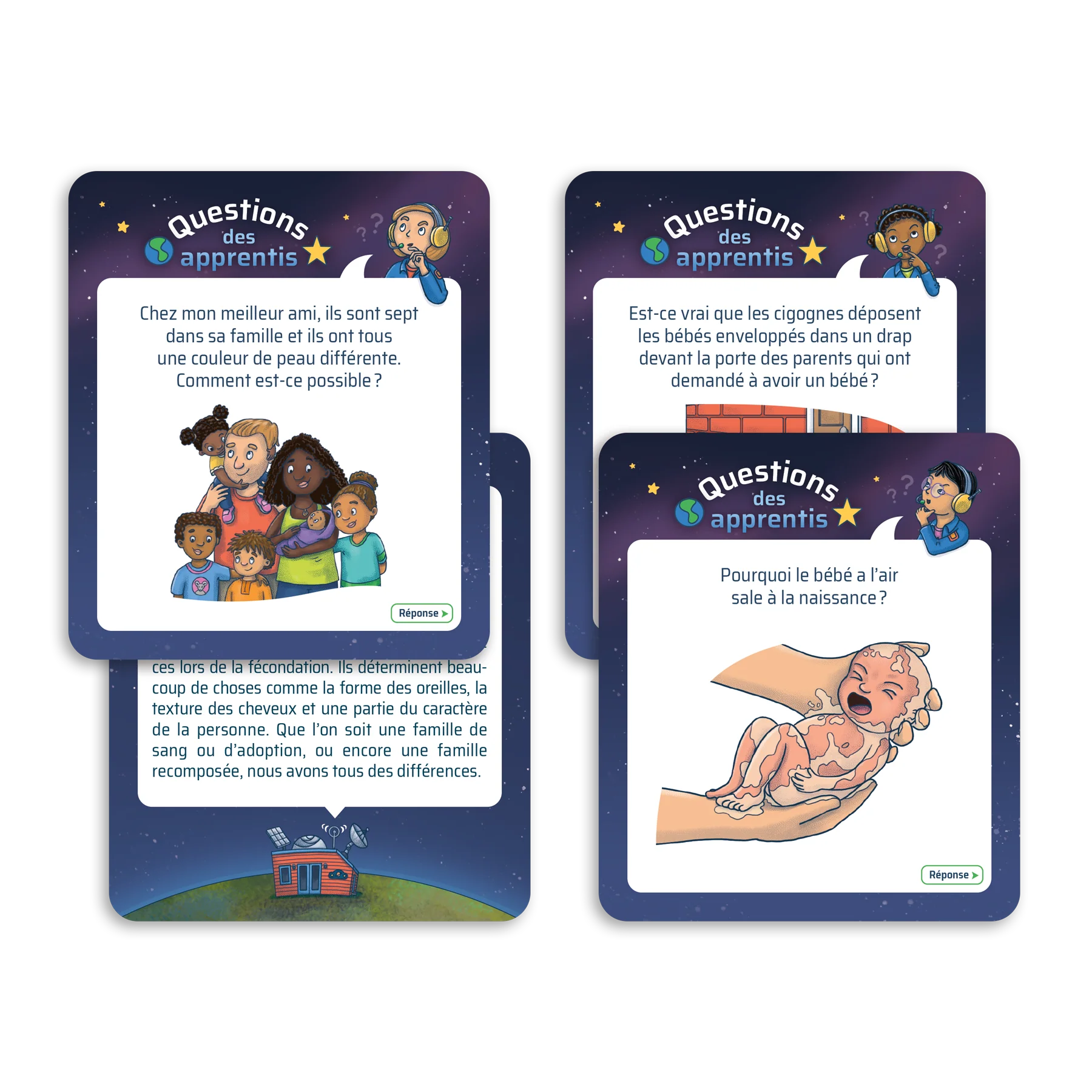 Houston, comment on fait les bébés? est un jeu coopératif pour les enfants de 4½ ans à 10 ans dans lequel les joueurs incarnent de jeunes astronautes en pleine préparation pour leur mission. Ensemble, ils explorent les bases de la reproduction, de la grossesse et de la naissance avec humour et curiosité, et partagent leurs connaissances tout en s'amusant. Prêt pour le décollage? Accompagne ces apprentis astronautes et aide-les à trouver des réponses à leurs questions avant que la fusée décolle vers la nouvelle planète!