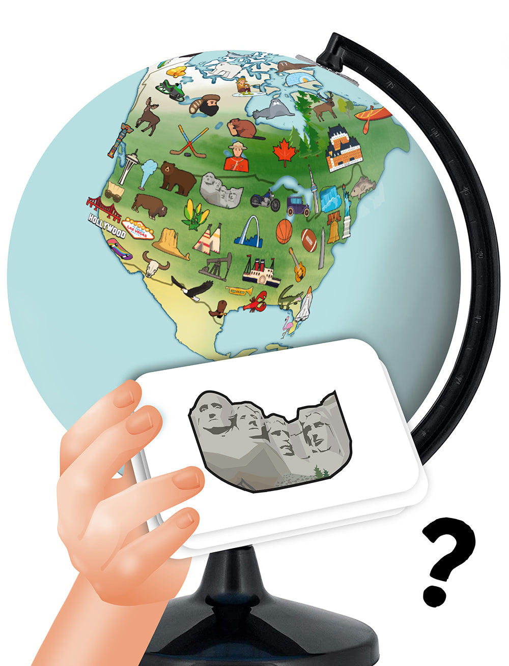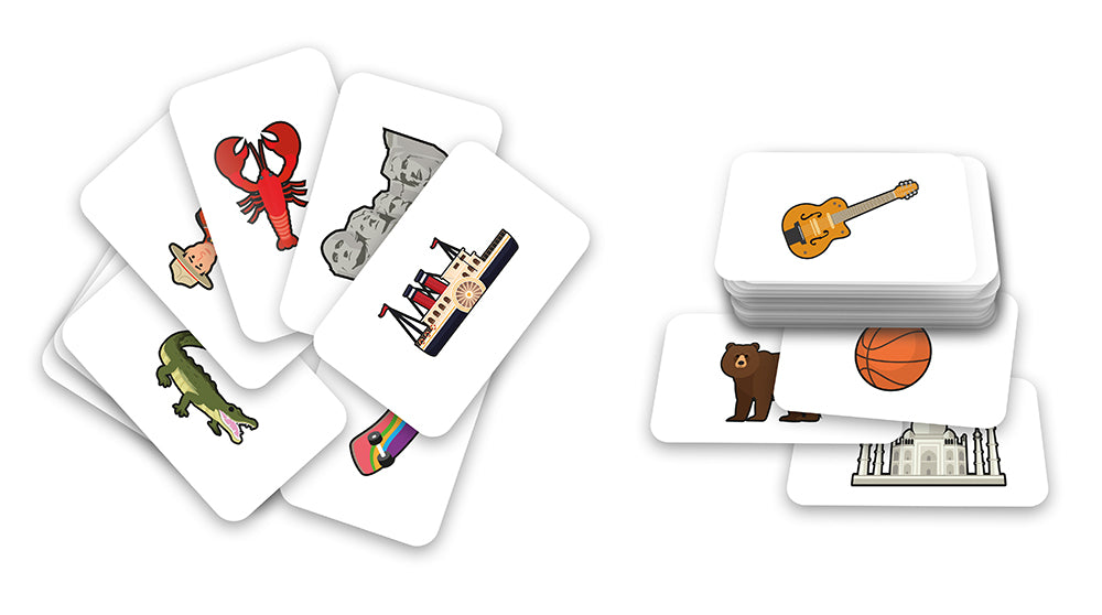 La carte comporte plus de 300 dessins : animaux, monuments, sports, plats culinaires... Objectif ? Retrouver le dessin sur le globe le plus rapidement possible. L’enfant tire une des 300 cartes, observe le dessin, retourne le sablier et doit retrouver le dessin avant que le sablier ne se soit écoulé. Au dos de chaque carte, l’enfant découvrira une anecdote ou une information.