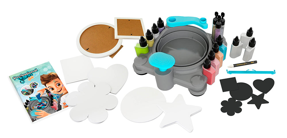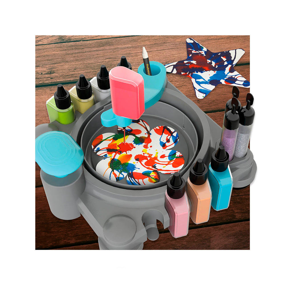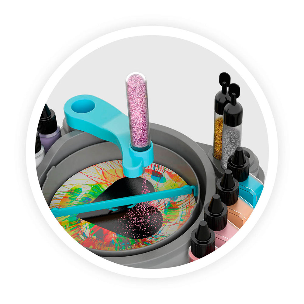 Place une feuille dans le plateau et un flacon de peinture sur le bras. D’une main, appuie sur le bouton pour faire tourner le plateau. Avec l’autre main, déplace le bras amovible et presse le flacon pour déposer la quantité de peinture souhaitée! Possibilité de placer un tube de paillettes sur le bras pour décorer sa création. Le plateau est amovible pour un lavage facile! Avec le crayon de cire et les gabarits, délimite des zones sur lesquelles la peinture n’ira pas.