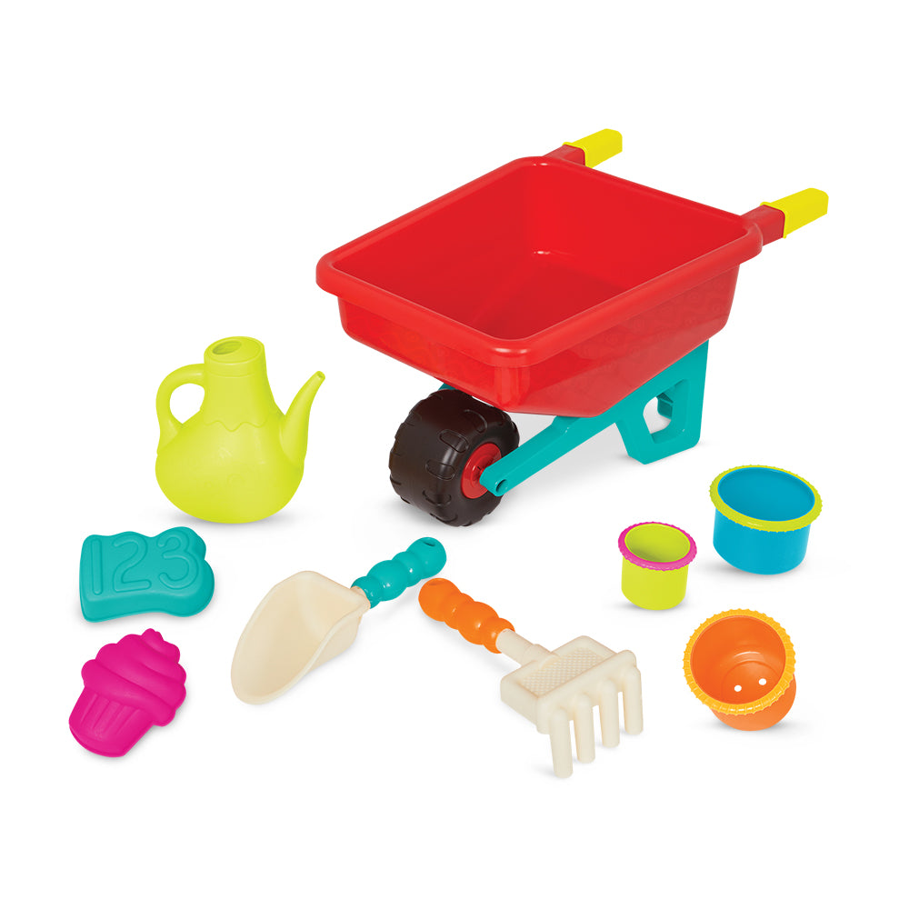 - Comprend : Une brouette, un arrosoir, une pelle, un râteau, 2 moules à sable et 3 gobelets.