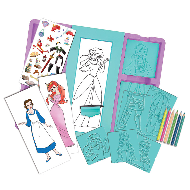 Découvrez le Studio de Designer pour enfant des Princesses de Disney, l'ensemble idéal pour créer des tenues uniques pour tes princesses préférées! Avec ce studio de création, les enfants peuvent laisser libre cours à leur imagination en sélectionnant des plaques pour concevoir des tenues personnalisées. Il leur suffit de placer les plaques dans la base du studio, d'utiliser le support à crayon inclus et de laisser parler leur créativité. Une fois le dessin terminé, les enfants peuvent ajouter de la couleur et des autocollants pour donner vie à leur création. Offrez à votre enfant des heures de plaisir et d'expression artistique avec ce studio de designer Disney Princesse!