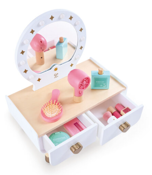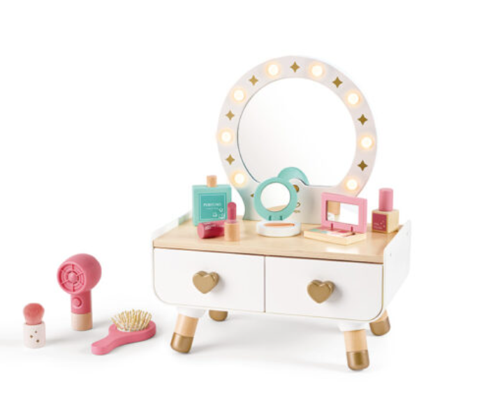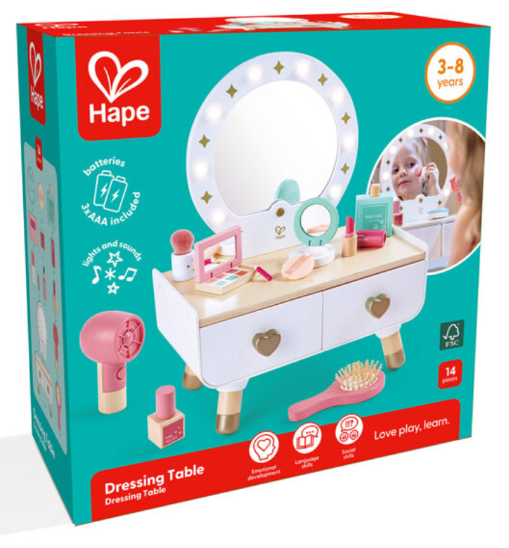 La coiffeuse élégante Hape est une véritable invitation à la créativité et à la découverte de soi ! Avec sa table de maquillage lumineuse et ses accessoires réalistes, elle stimule les compétences motrices fines et encourage le jeu imaginatif.