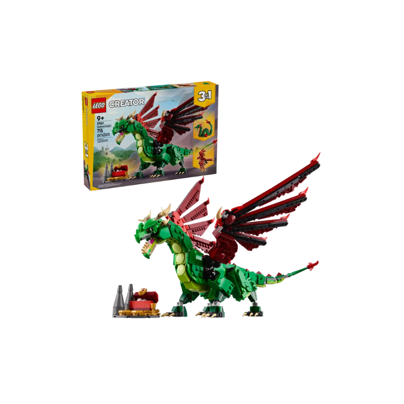 Faites plaisir à votre petit voyageur dans le temps avec l’ensemble de jeu LEGO® Creator Le dragon médiéval (31161). Mettant en vedette une figurine de dragon qui permet aux garçons et aux filles de 9 ans et plus de simuler des actions médiévales palpitantes, il a une paire de grandes ailes mobiles qui se déplacent de haut en bas et se replient vers l’intérieur et l’extérieur, ainsi que des chevilles, des orteils, un cou, une mâchoire, des hanches et des épaules mobiles. Il est également livré avec un coffre au trésor pour une valeur de jeu supplémentaire.