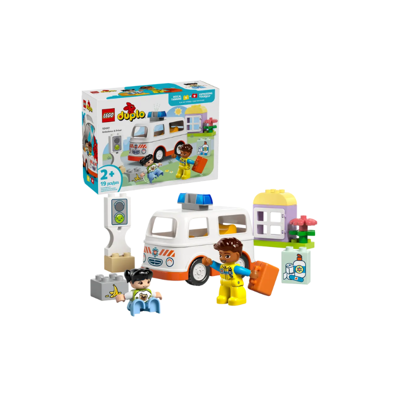 Des tout-petits attentionnés simulent des scènes de sauvetage passionnantes avec le jouet Ambulance et chauffeur (10447) pour les enfants d’âge préscolaire. Ce jouet pour tout-petits comprend une ambulance que l’on peut conduire et deux figurines LEGO® DUPLO®, un ambulancier et une fille, pour un jeu imaginaire créatif.