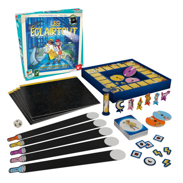 Explorez la nuit avec vos Éclairtout et débusquez les mystères cachés dans l'obscurité ! Un jeu où l'observation et la rapidité sont au cœur de l'action. Ce jeu familial, imaginé pour 2 à 5 joueurs, vous transporte dans un monde nocturne peuplé de personnages farfelus à retrouver grâce à votre lampe de poche. Les Éclairtout est un jeu accessible pour les petits comme les grands, parfait pour des moments de jeu conviviaux en famille ou entre amis. • Un jeu de cherche et trouve rafraichissant • L'effet Waouh! de la lampe • De nombreuses cartes pour un challenge toujours différent