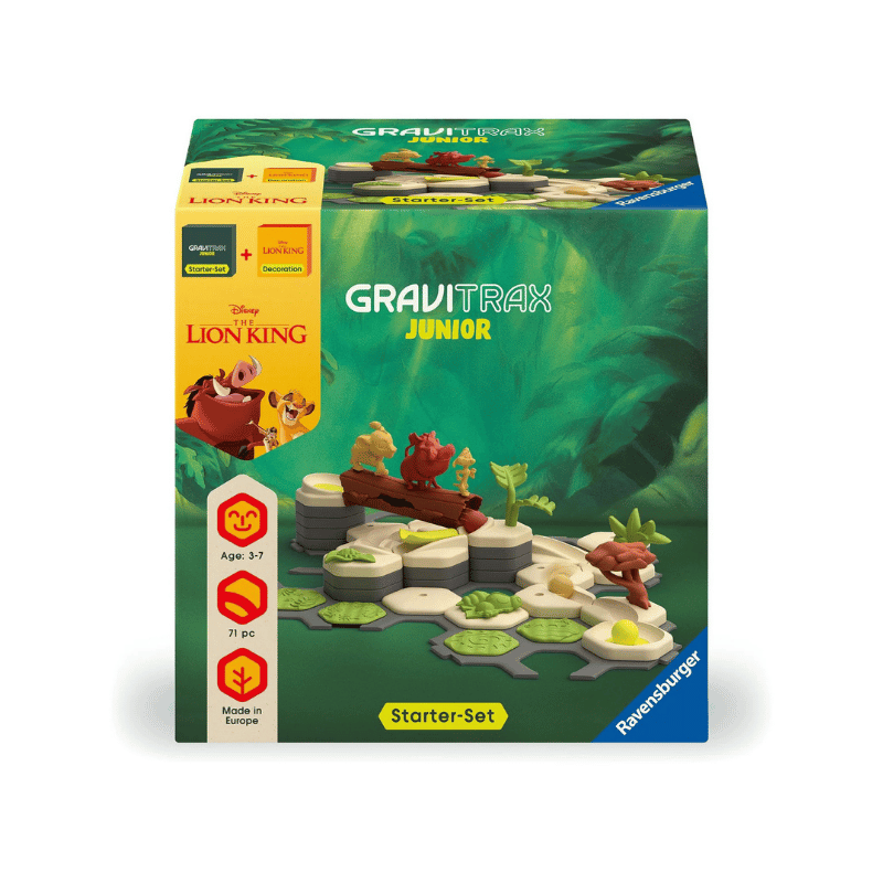Imaginez un véritable univers aux décors inspirés du monde réel. Votre enfant thématise ses circuits et plonge dans un monde magique GraviTrax pour créer ses plus belles histoires ! Au total, 71 pièces sont à retrouver dont les pièces de jeu entièrement adaptées au Disney Le Roi Lion avec 9 personnages en 3D à ajouter au circuit.