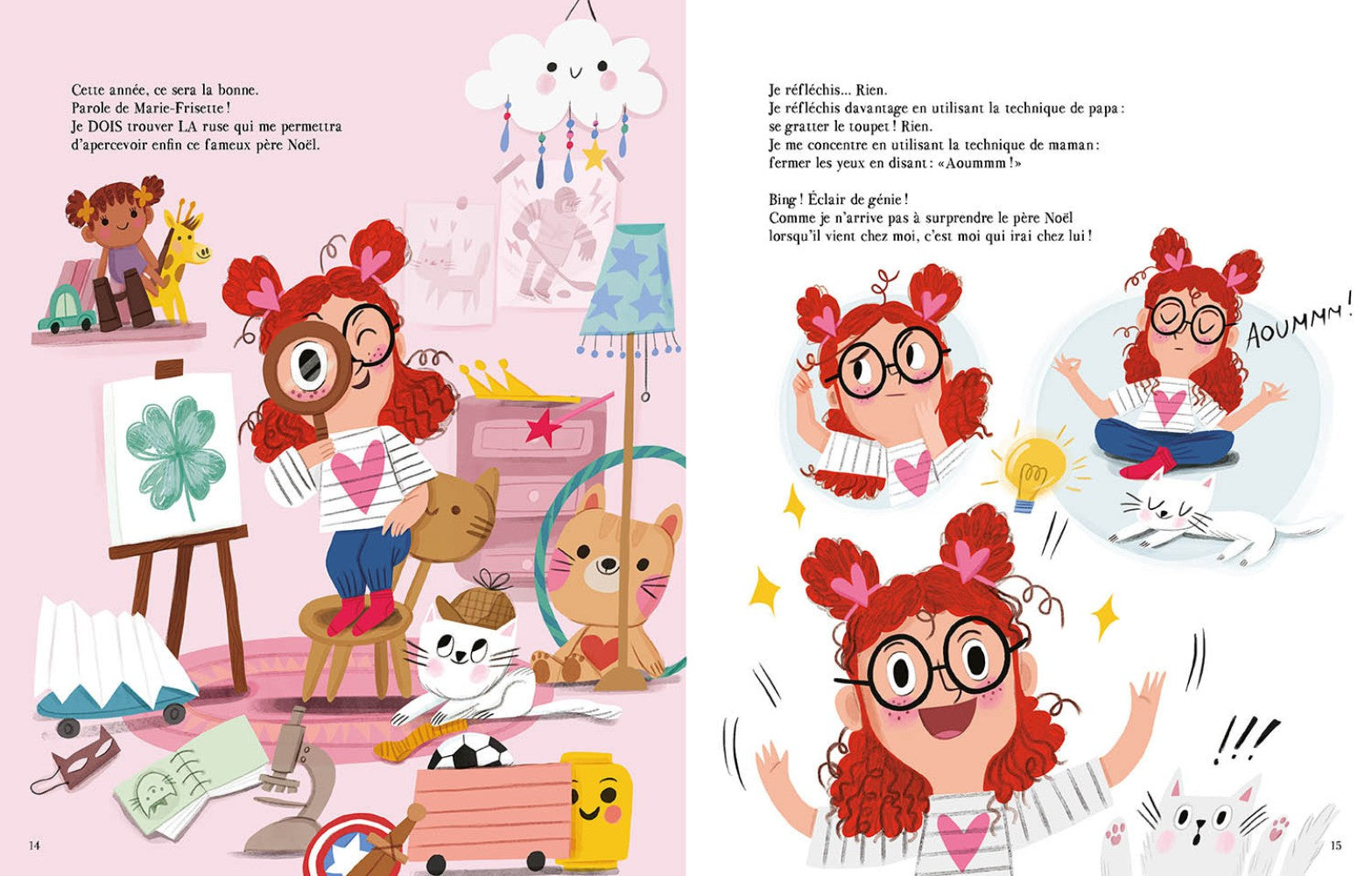 Moi, Marie-Frisette, j’ai beaucoup d’imagination ! Et des rêves plein la tête !Mais depuis TOUJOURS, mon rêve NUMÉRO 1, c’est de voir le père Noël ! Malgré mes stratagèmes, mes talents d’espionne et mes yeux de lynx, j’essuie chaque fois un cuisant échec. Pfff !