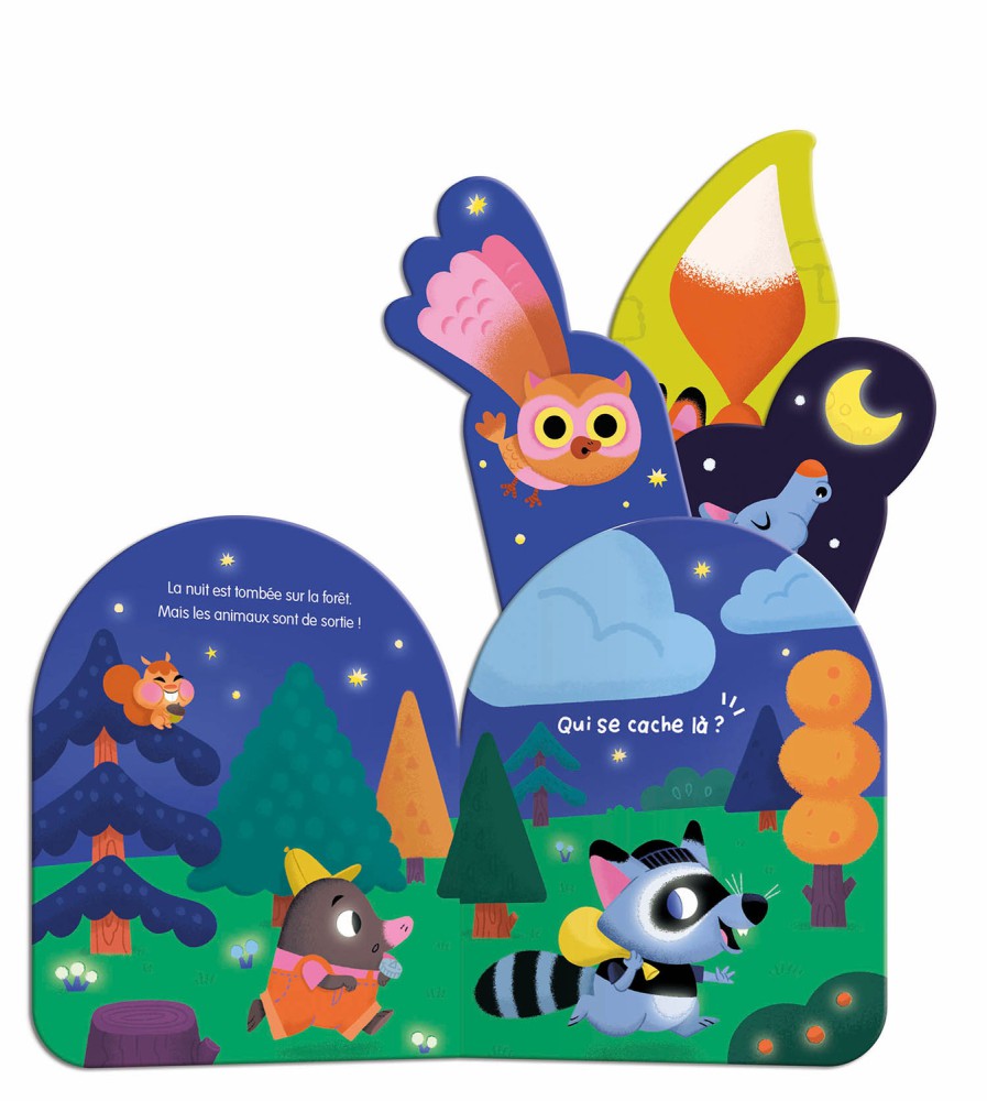 The animals are playing hide-and-seek in the night... Pull on the elements that stick out and listen to the sounds to discover who is hiding on each page. New: phosphorescent varnish on each page to make the book glow in the dark!