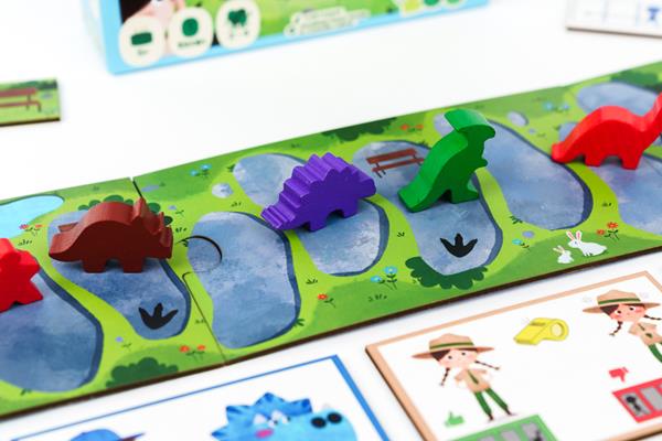 Auteurs: Jonathan Favre-Godal, Corentin Lebrat C’est jour de balade à Dino Parc ! Les maîtres sont de sortie, accompagnés de leur fidèle Dino de compagnie. Très vite une compétition s’organise : quel Dino sera le plus rapide à atteindre les grilles du parc ? Tout ce petit monde prend le départ sur l’allée centrale mais attention à Billy, la gardienne du parc, qui veille et qui ne supporte pas de voir les dinos trop loin de leur maître ! Dans Baladino, les joueurs incarnent des maitres qui baladent leur Dino de compagnie. Une course est organisée dans l’allée centrale de Dino Park et le premier Dino à atteindre le bout de l’allée est déclaré vainqueur. Chaque joueur doit gérer la progression de 2 pions : son pion Dino ET son pion Maître. Pour avancer, les joueurs lancent le dé et déplacent au choix leur pion Dino ou leur pion Maître. Pour gagner la partie, seul le pion Dino compte et il serait logique de n’avancer que ce pion-là, MAIS c’est là que Billy, la gardienne du parc, intervient ! Billy est stricte et ne supporte pas que les Dinos soient trop éloignés de leur Maître. Quand un joueur obtient le sifflet au dé, si son Dino est à plus de 3 cases devant son pion Maître, il doit reculer son Dino sur la même case que son Maître. À chacun sa technique, audacieuse ou prudente pour avancer et gagner la course! • Un jeu simple et rapide • Un soupçon de prise de risque • Un jeu à rebondissement • Une thématique forte auprès des enfants