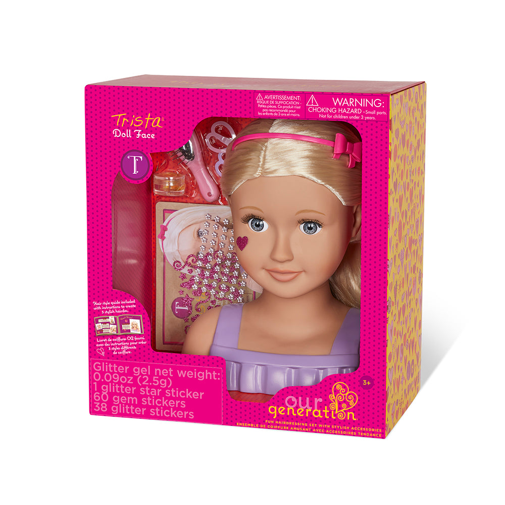 - Includes: 1 doll torso, 1 plastic headband with bow, 1 comb, 2 heart clips, 1 small pot of glitter gel, 2 sheets of glitter stickers and 1 hair style booklet.