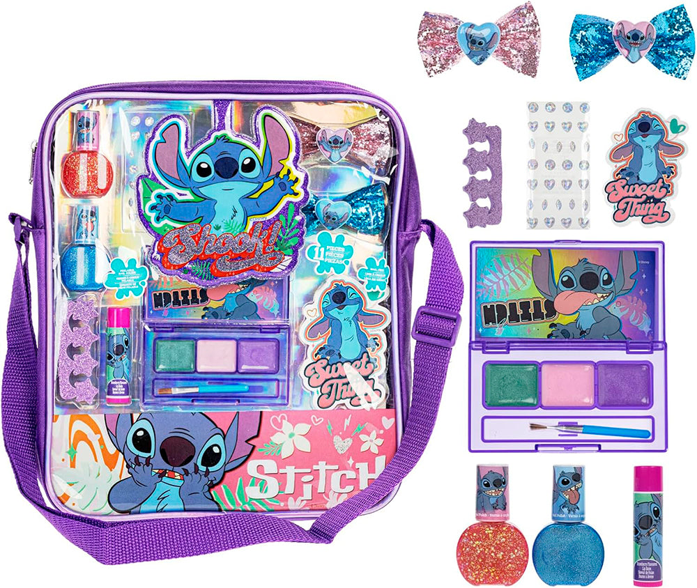 Maquillage sur le pouce avec ce sac à bandoulière Stitch Cosmetic rempli de maquillage! L'ensemble comprend un baume à lèvres, des vernis à ongles, des accessoires pour les cheveux et tout ce dont ils ont besoin pour obtenir un look fabuleux. Désormais, vos enfants peuvent se maquiller n'importe où, n'importe quand! Parfait pour la rentrée scolaire et les fêtes de fin d'année.