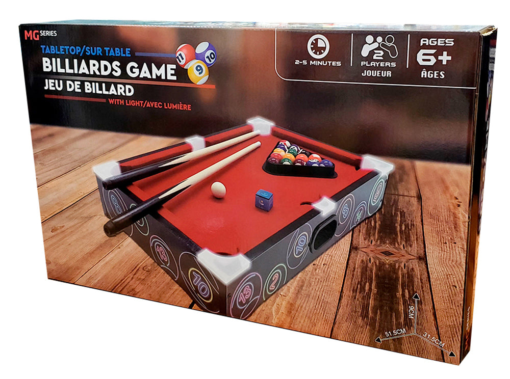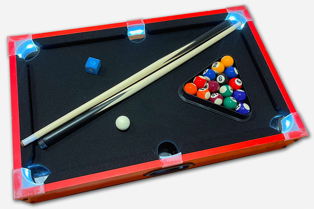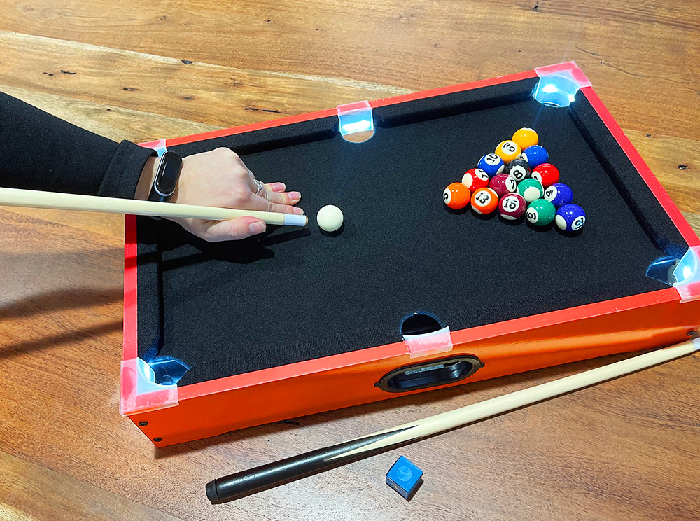 Experience the excitement of playing pool at home with this light-up tabletop pool game!