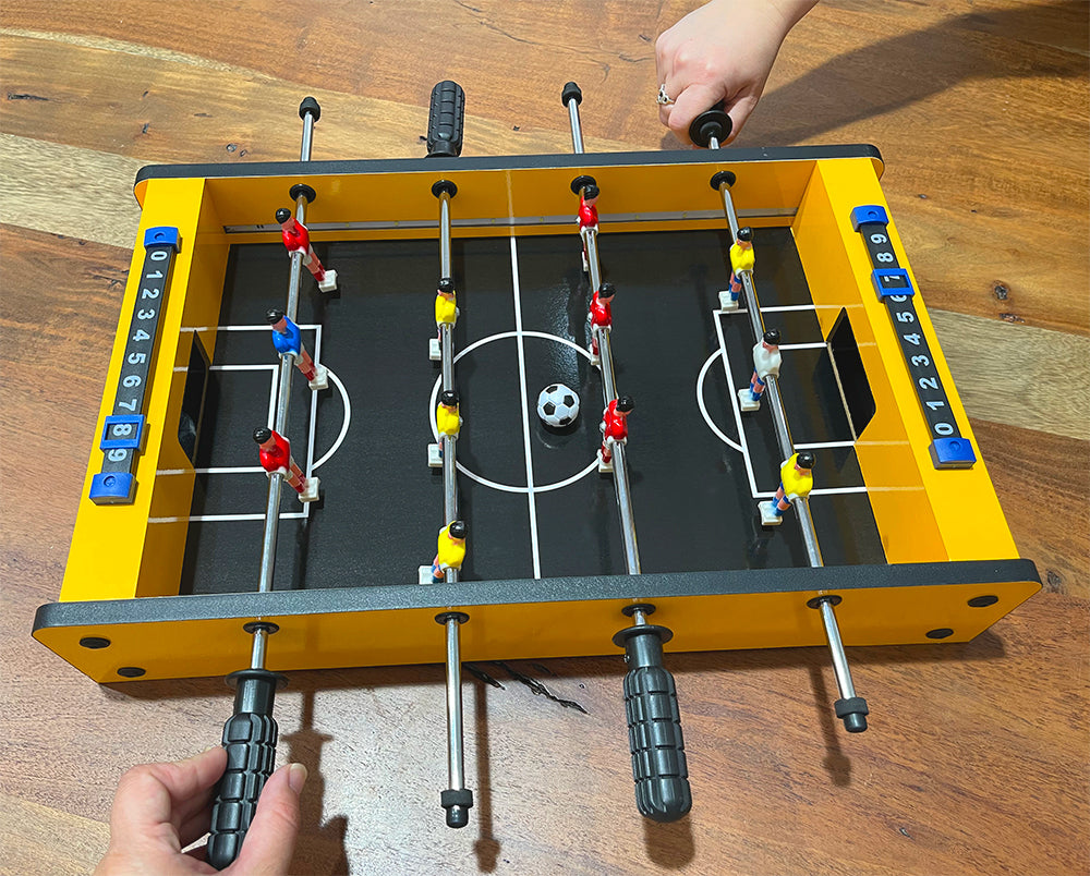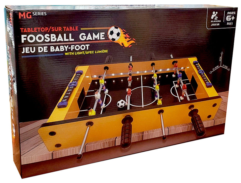 With built-in lights for exciting play, this foosball table is easy to set up and use. Measuring 51.5cm x 31.5cm x 9cm, it is perfect for tabletop play. The game includes two teams of plastic players, a soccer ball and a manual scoreboard. Enjoy competitive play with friends and family with this lighted foosball table!