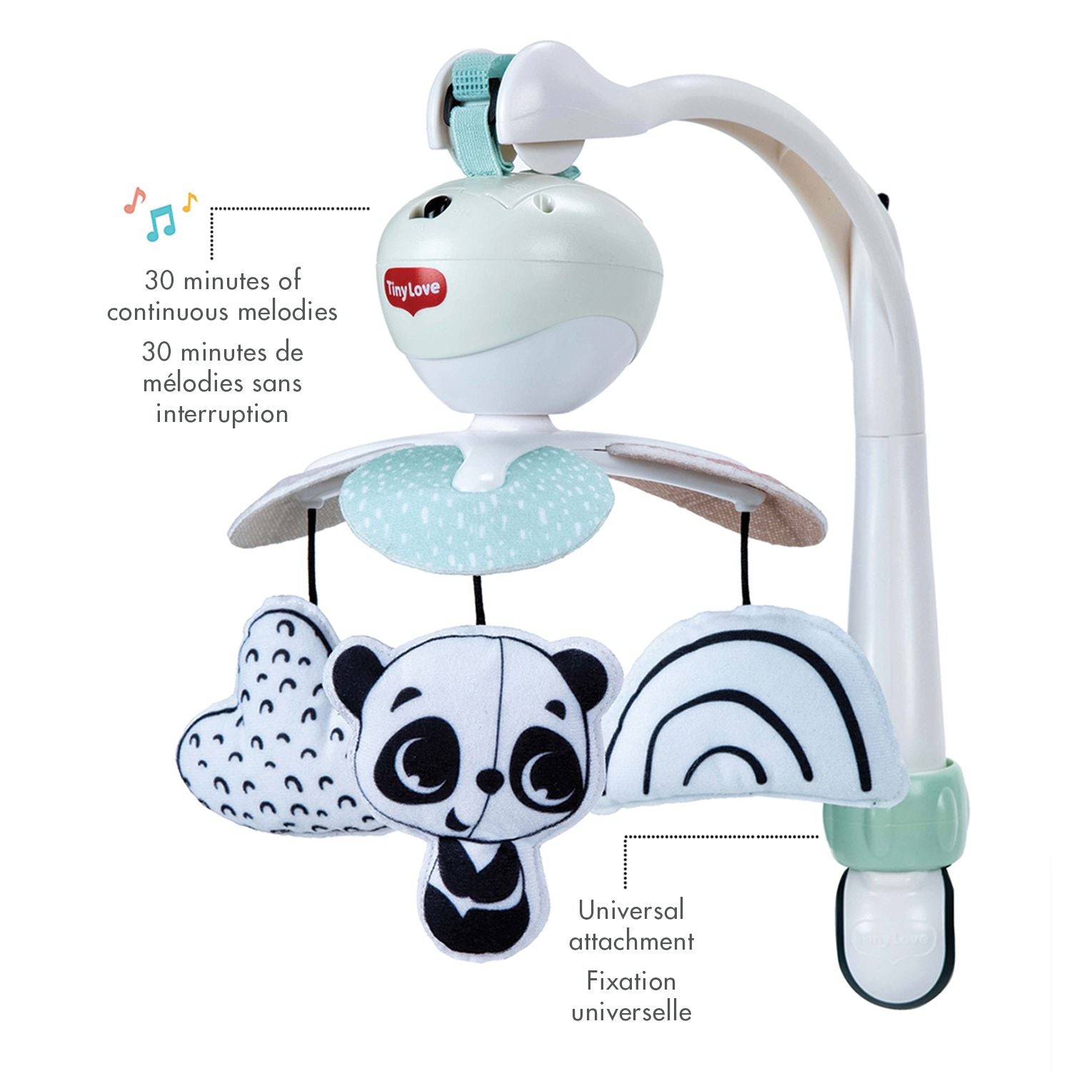 The mobile offers 30 minutes of music and 5 charming melodies that will soothe and entertain your little one. The black and white characters that hang and spin provide important visual and emotional stimulation for young babies and encourage them to make sounds and communicate. Thanks to its clever design, this mobile attaches easily to most playpens, travel cots, strollers and bassinets, making them the ideal travel toy.