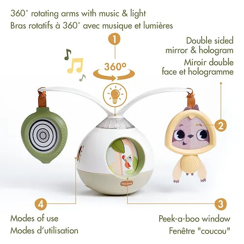 Turn tummy time into a fun experience with this innovative and engaging mobile for tummy time. This versatile product is both a tummy time mobile and an easy-to-carry mobile, featuring a large clip for easy attachment. It provides many developmental benefits by stimulating baby's senses, motor skills and cognition through fun and engaging features and sounds. In addition, the choice between different sound modes allows you to perfectly adapt the mobile to the baby's needs. It also grows with the baby, providing a play experience adapted to each stage of their development.