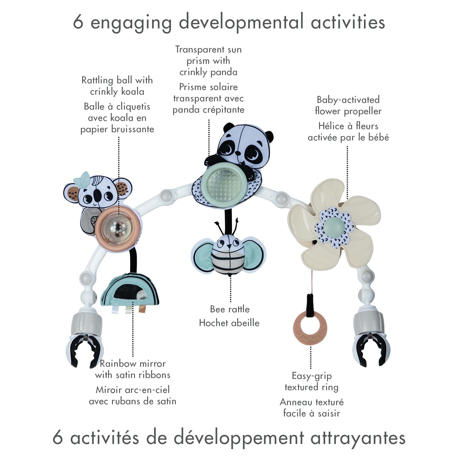 The Sunny Stroll Stroller Arch from Tiny Love offers babies 6 fun activities that allow them to have fun indoors and on the go. With its contrasting black and white colors, this stroller arch stimulates babies' vision development from day one.