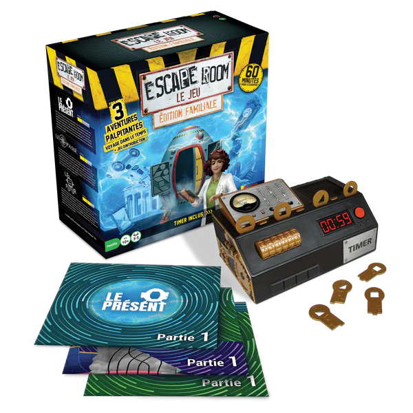 The Time Travel box set contains 3 different adventures! Each adventure is divided into 3 parts. For each part, you must find a code that consists of 4 keys to put in the Timer. Find the 3 correct codes in less than 60 minutes to win. You win or lose together… The three adventures included in the Time Travel box set are, in order of difficulty: “The Present”, “The Past” and “The Future”.