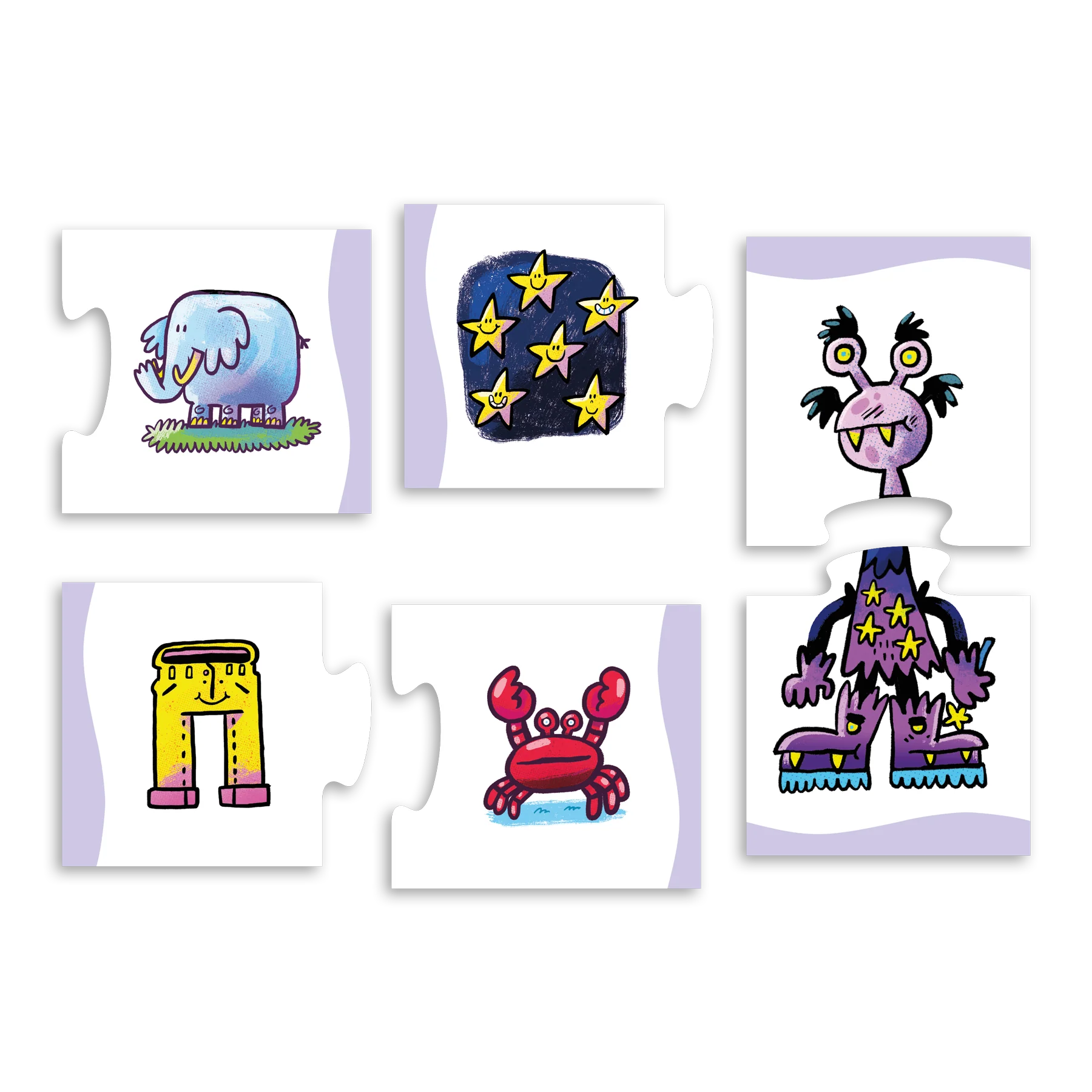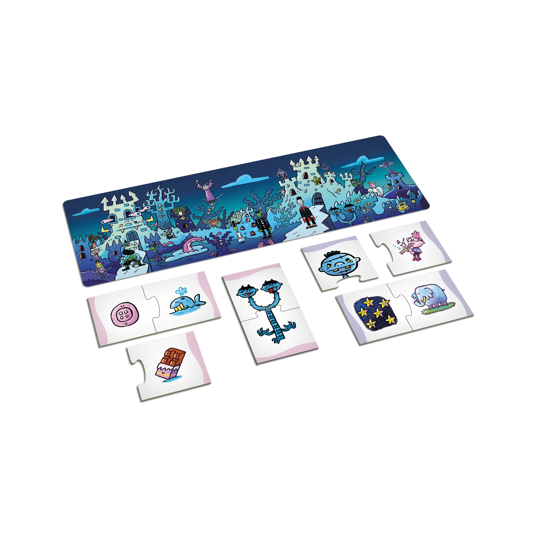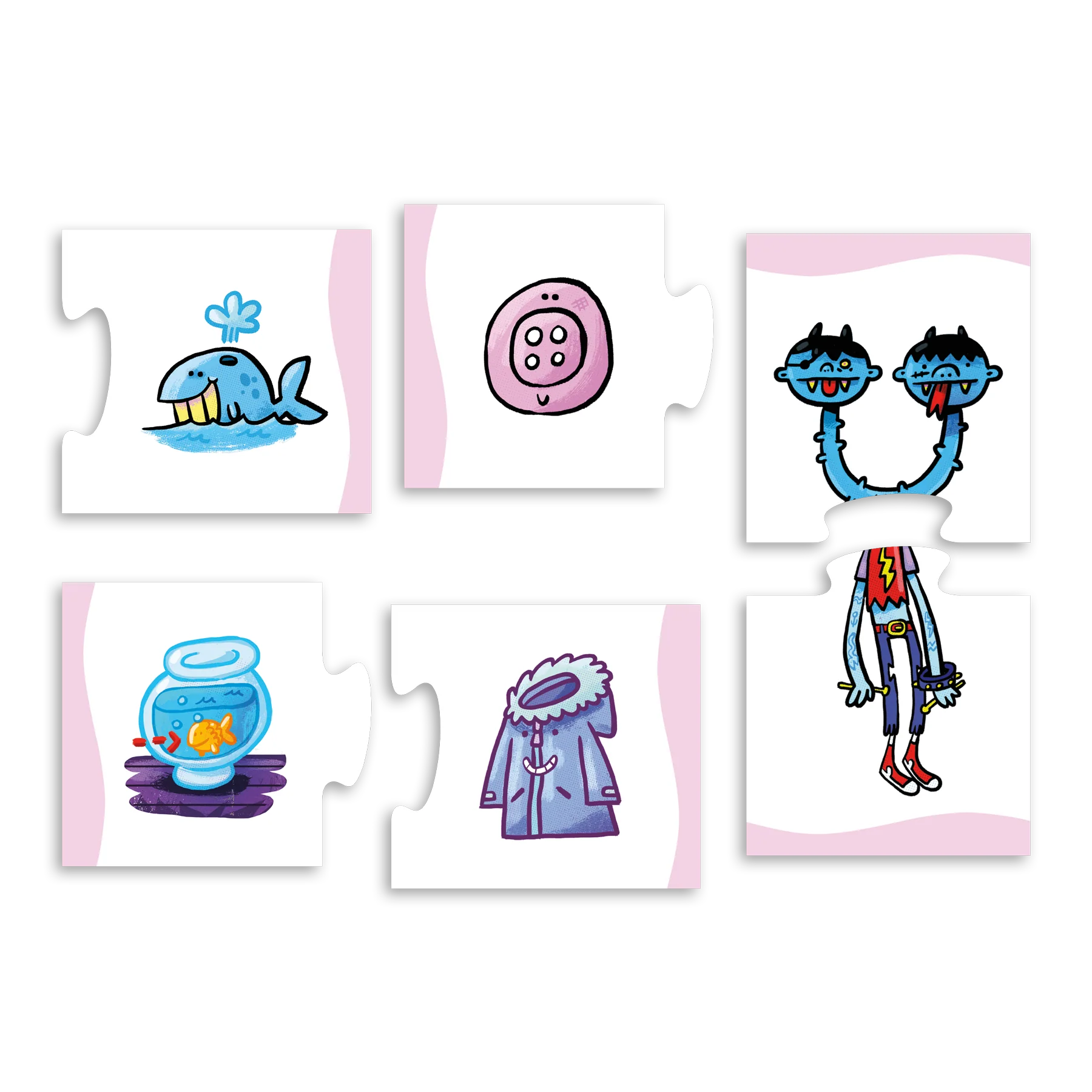 Each game includes 2 sets of 26 pieces as well as a game board. After assembling the correct puzzle pieces, the player discovers a creature that he must then search for on the game board in the manner of a seek and find game.
