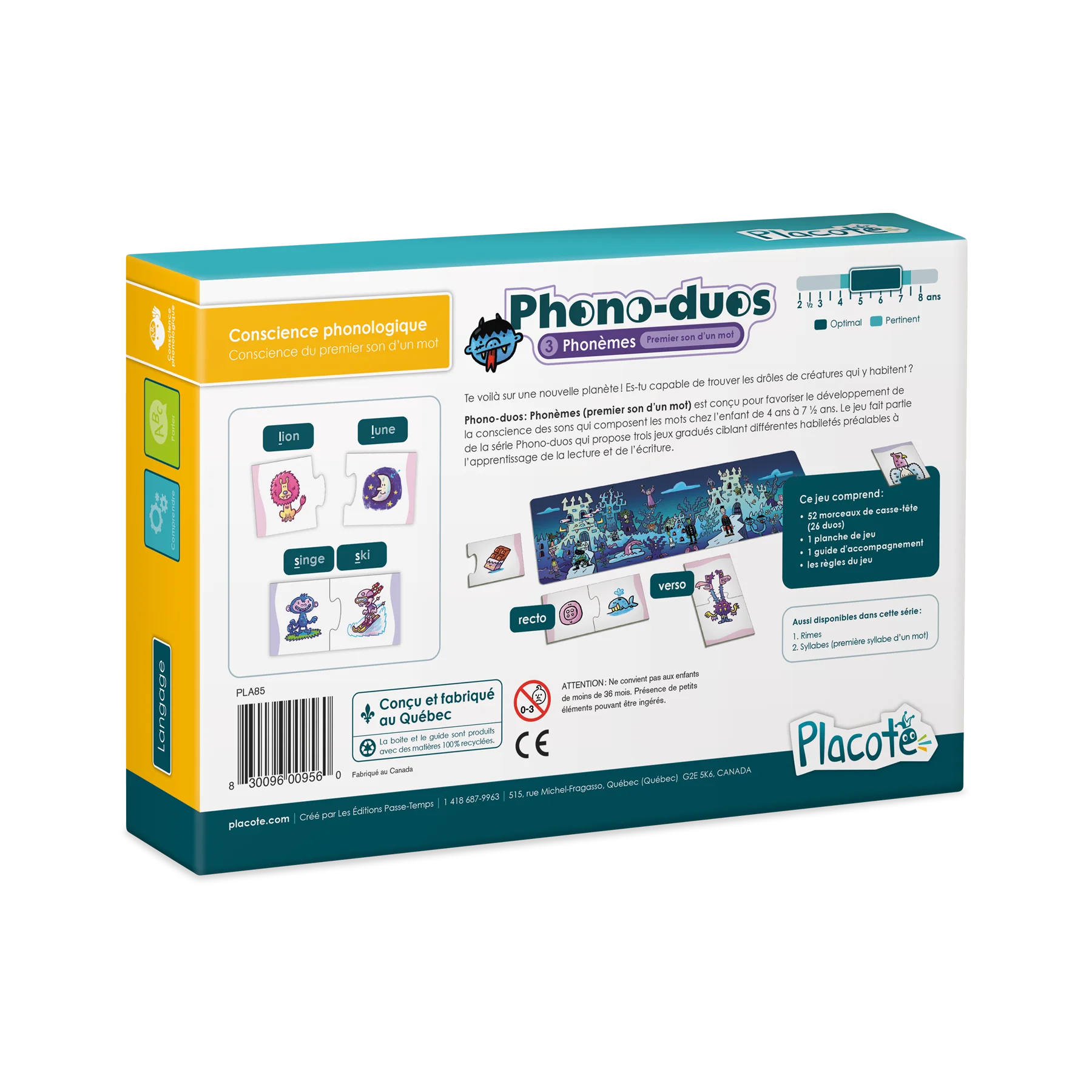 Phono-duos: Phonemes (first sound of a word) is designed to promote the development of sound awareness in 4- year-old children at 7 ½ years. The game is part of the series Phono-duets which offers three graded games targeting different skills prior to learning to read and write.